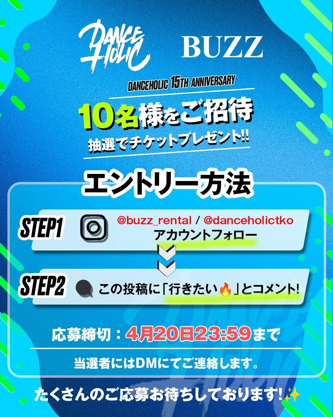 全国84店舗以上を展開するレンタルスタジオ「BUZZ(バズ)」を運営する株式会社BUZZ GROUP(本社:東京都港区、代表取締役:渡辺 憲)は、ダンスイベント「DANCEHOLIC 15th ANNIVERSARY」とのコラボレーションキャンペーンを実施していることをお知らせいたします。