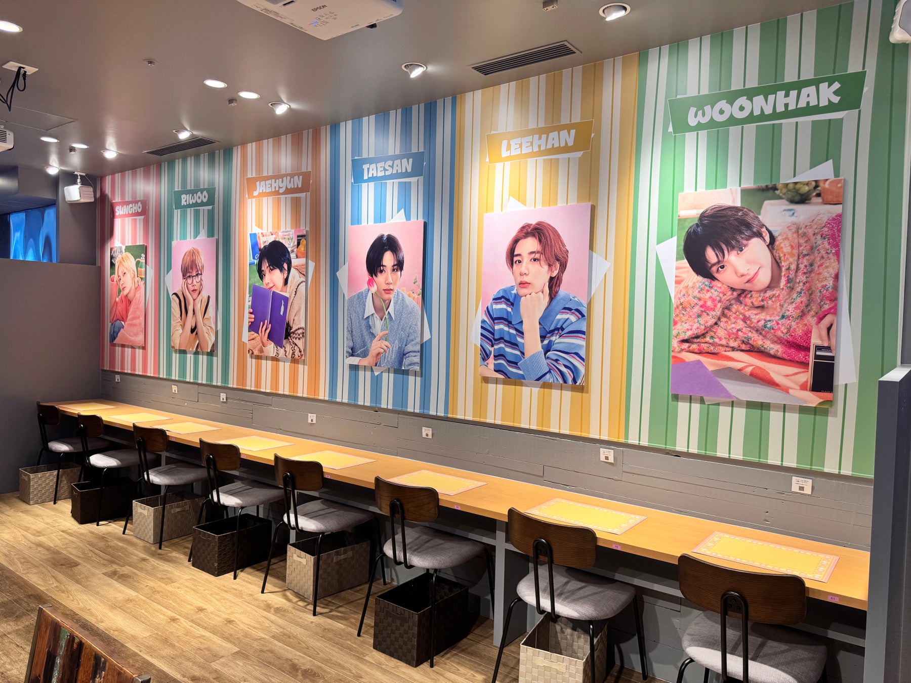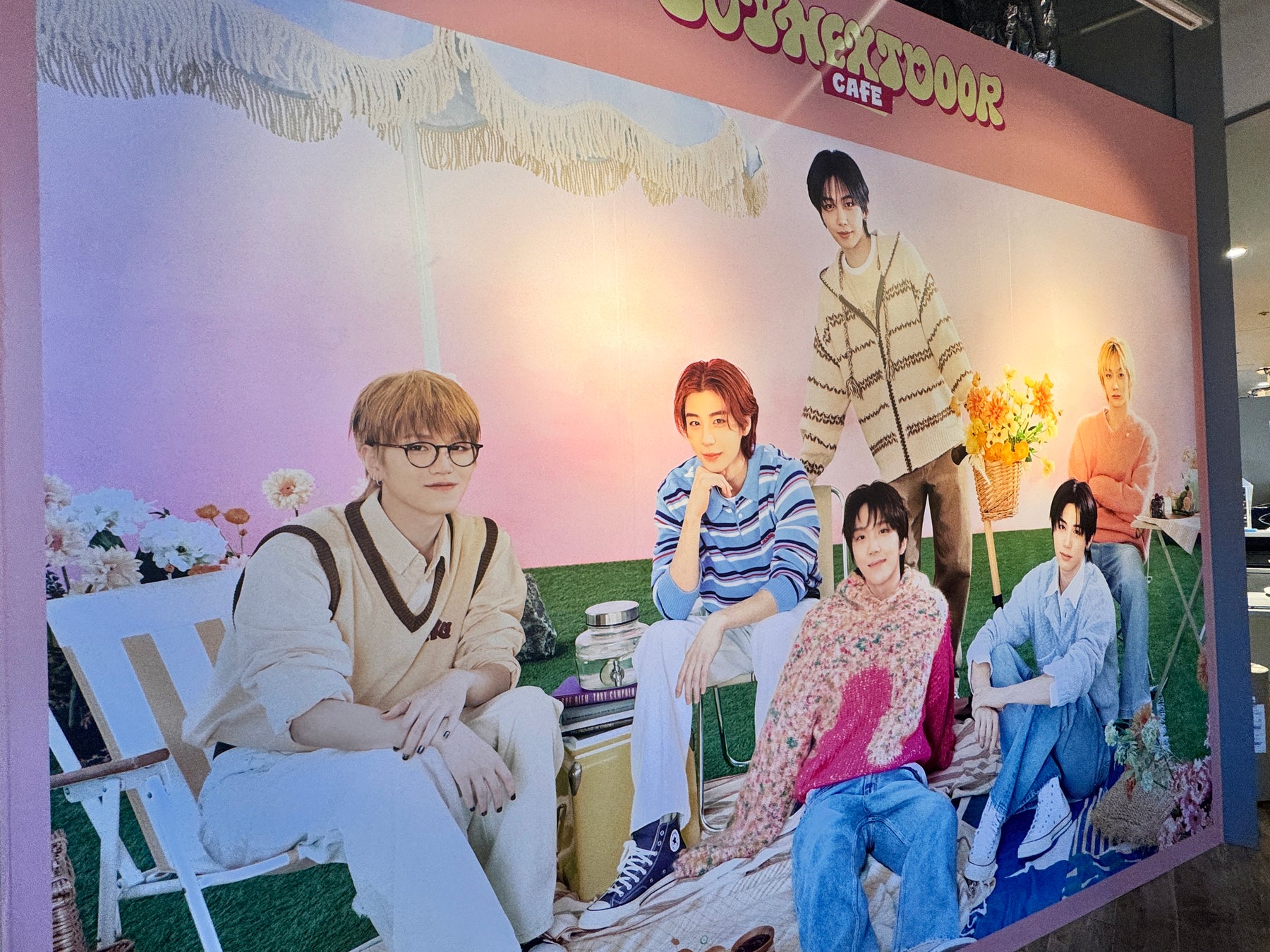 カフェに入った瞬間、BOYNEXTDOORの爽やかなビジュアルとともに明るく可愛いらしい空間に包まれます。6人のメンバーたちと一緒にピクニックをしているような楽しい気分で、色とりどりフードやドリンクをお楽しみいただけます。また、店内では、カフェでしか観られないBOYNEXTDOORの映像や、カフェ限定の特典など、多彩なコンテンツも用意されております。