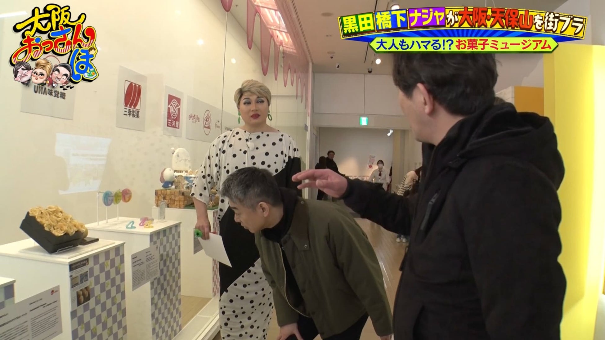 まずは「お菓子が大好物」というナジャにぴったりの新スポット「お菓子ミュージアム天保山」へ。ユニークな社長に案内されて、館内を巡るおっさんたち。懐かしい駄菓子や未来のお菓子を見学して大興奮!