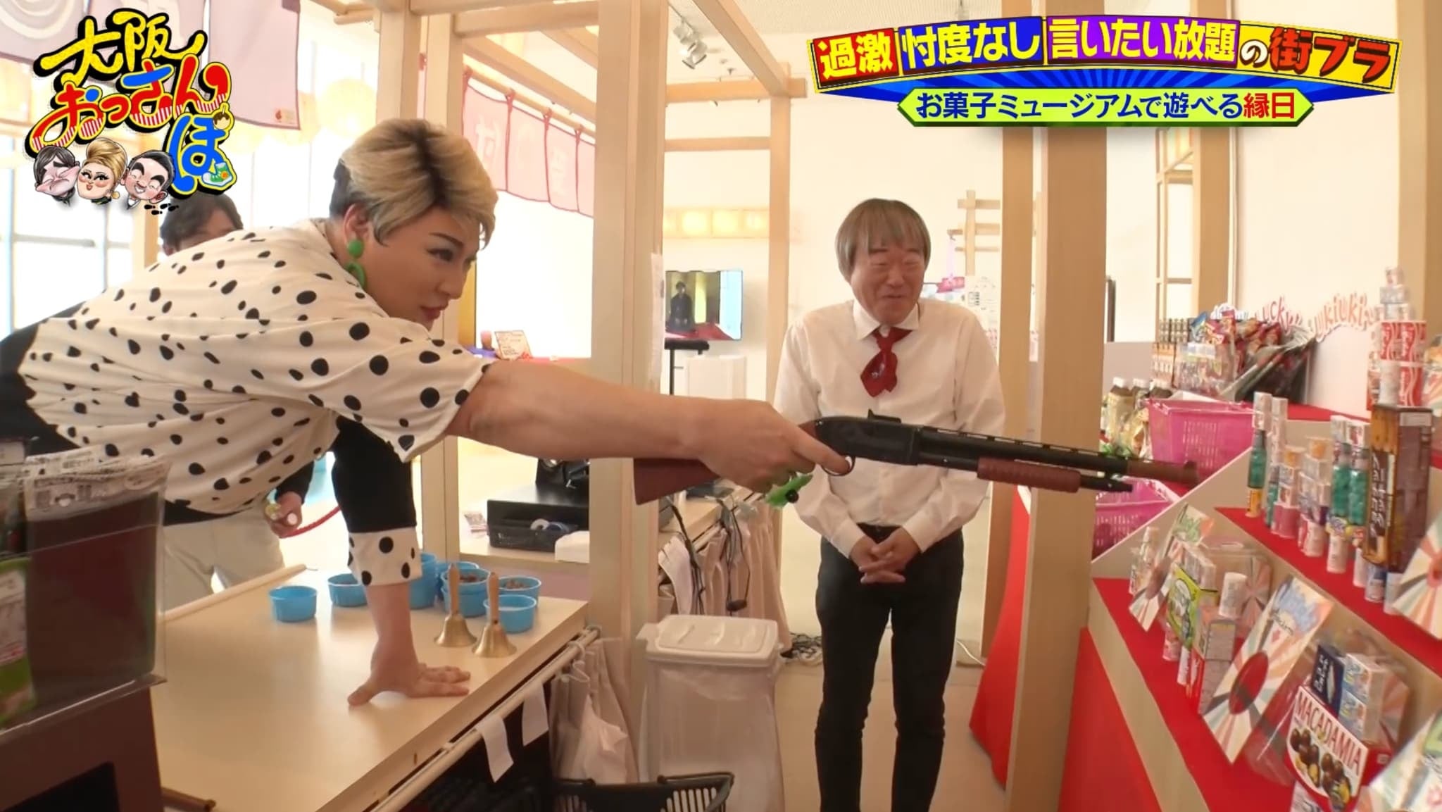 縁日ゾーンの射的で遊んだりと童心にかえったおっさんたちは、最後に土産ゾーンへ。全国各地のお菓子が1500種類以上集まるフロアにおっさんたちは大喜びで爆買い! しかし、「おいしいんです」と珍しいお菓子をどんどん試食させてくれる社長におっさんたちもさすがに困惑!?