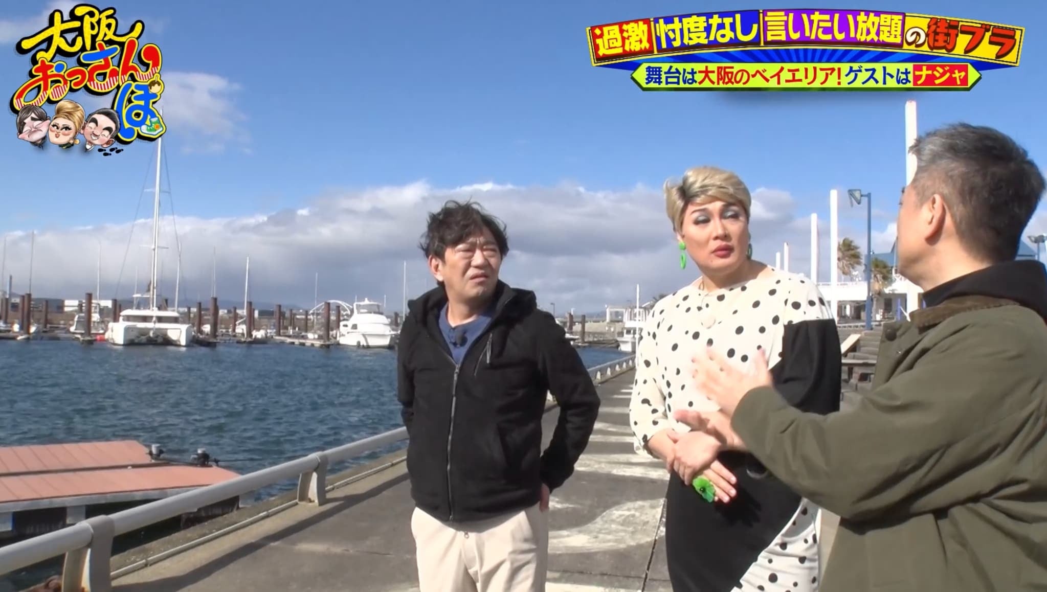 ロケは、大阪北港マリーナのヨットハーバーからスタート。橋下がのっけからこの場所にまつわる大阪市長時代の自慢話を繰り出し、黒田は「海に落としたいな……」とボソリ。続けてナジャに「ごめんな、言いたがるねん」と謝るとナジャは「慣れてますから」と涼しい顔。