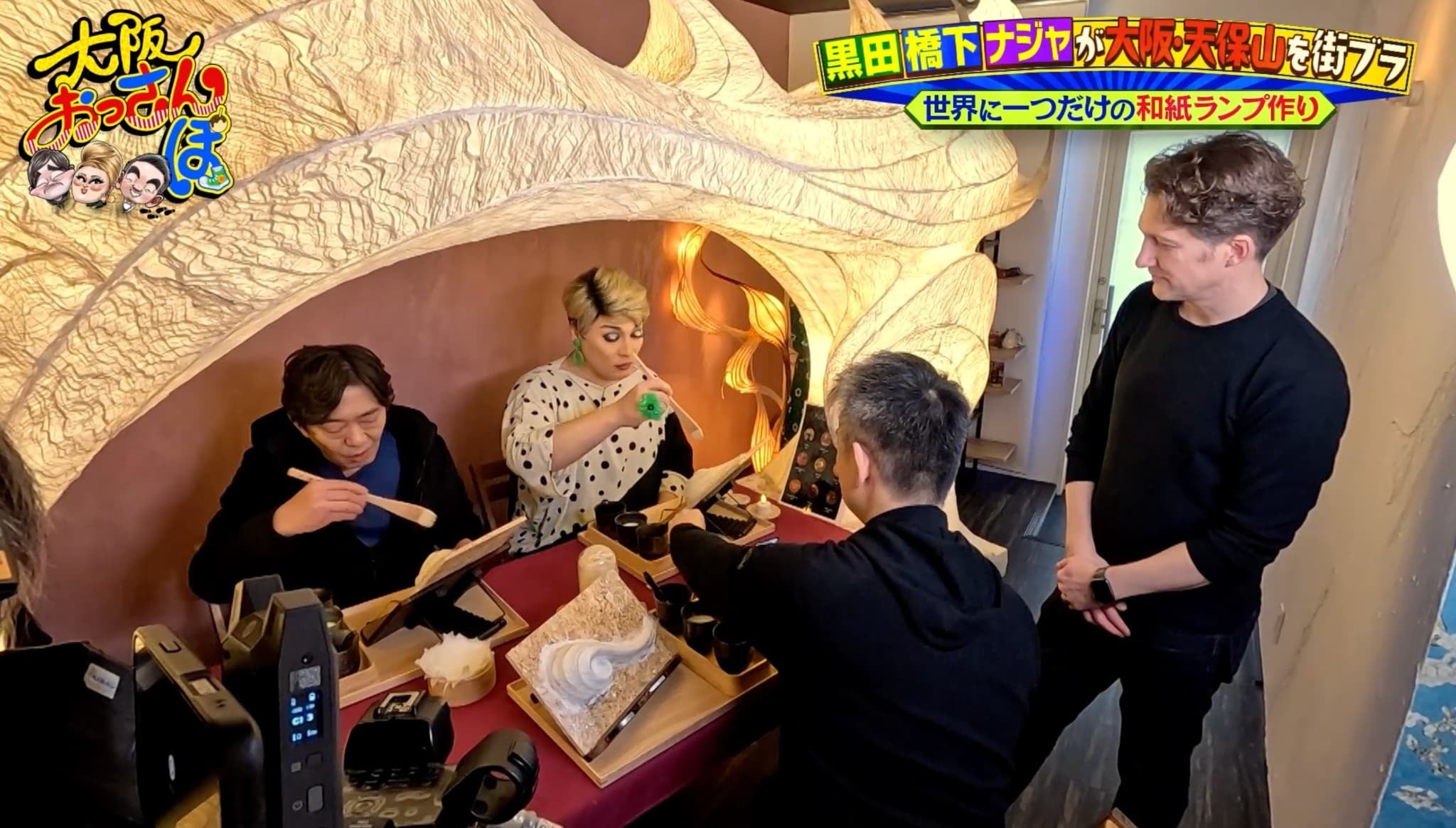 「お菓子ミュージアム天保山」を後にし、港商店街を散策。昭和レトロな町並みの中で見つけたおしゃれな店「JeBon」に立ち寄る。ここで和紙ランプを作る体験ができると聞いて、さっそく挑戦。この店は国際結婚したご夫婦が営んでいて、夫婦の運命的な馴れ初めに耳を傾けながらランプ作りを楽しむ。