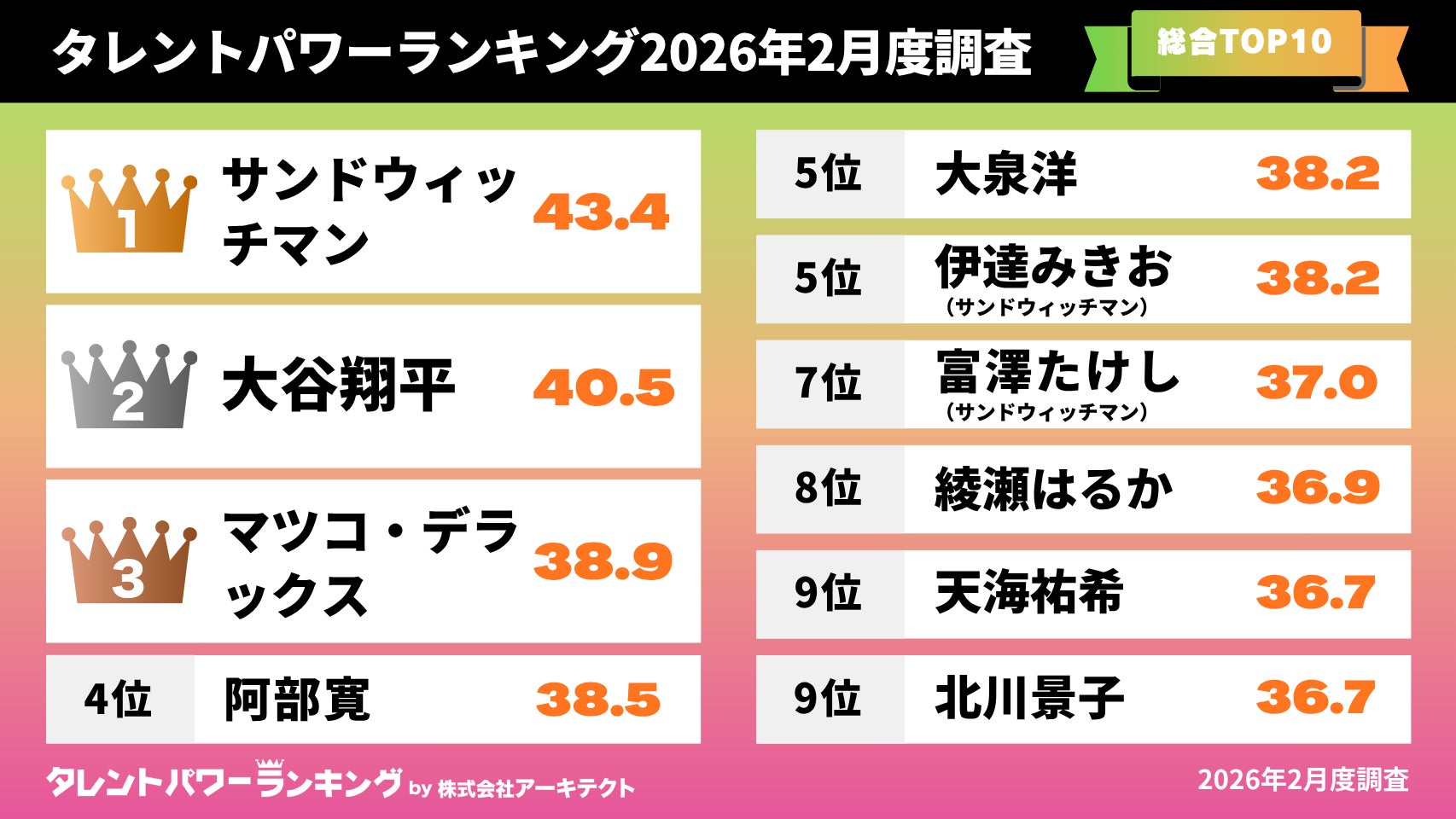 「タレントパワーランキング」2026年2月度調査(第1四半期)総合トップ10を発表!