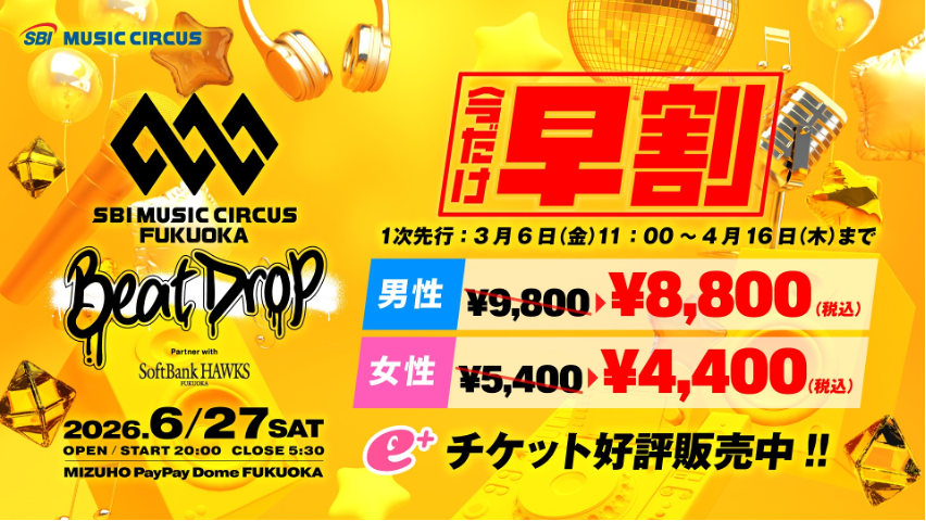 株式会社TryHard Japan(NASDAQ: THH 上場 TryHard Holdings Limited の子会社)は、福岡ソフトバンクホークス株式会社(本社:福岡市中央区、代表取締役社長CEO:後藤 芳光)と共催で、2026年6月27日(土)にみずほPayPayドーム福岡にて開催する「SBI MUSIC CIRCUS FUKUOKA -Beat Drop- partner with SoftBank HAWKS」の第2弾出演アーティストを発表しました。
