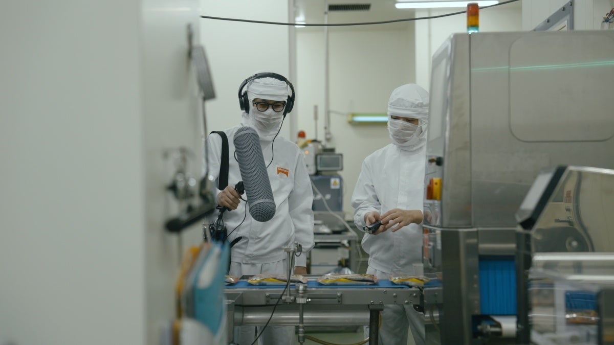 パソコン音楽クラブ自らがテーブルマークの中央工場へ足を運び、音を採集。防護服を着用して潜入した工場でのエアシャワー音、形を作り上げるヘラの音、製品ラインのスライド音といった、普段は表に出ない現場のリアルな鼓動をアーティストの視点で丁寧に収録しました。