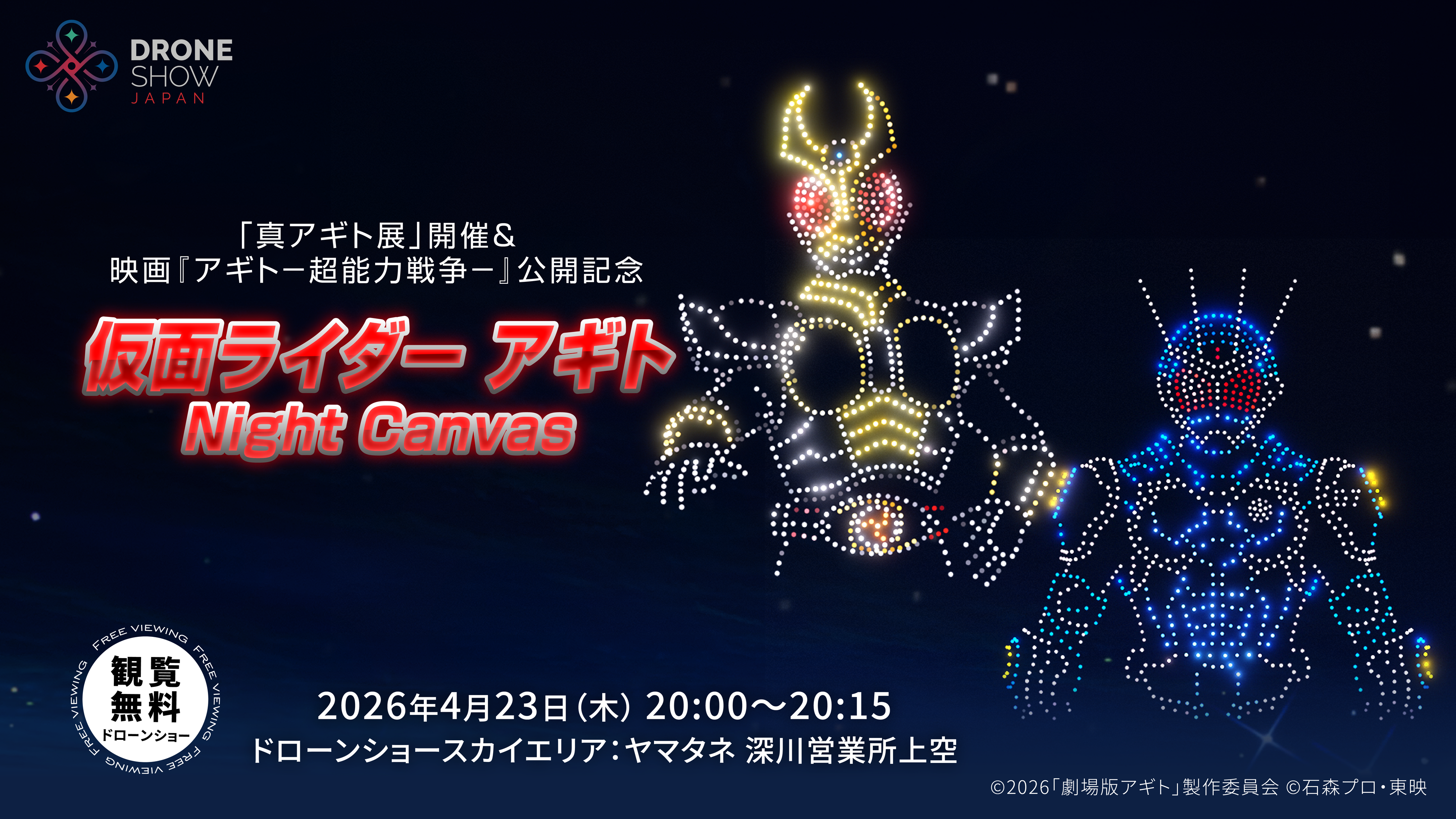 株式会社ドローンショー・ジャパン(本社:石川県金沢市、代表取締役:山本 雄貴)は、東映株式会社・東映ビデオ株式会社との共催により、ドローンショー【「真アギト展」開催&映画『アギト-超能力戦争-』公開記念 仮面ライダーアギト Night Canvas】を、2026年4月23日(木)に東京・深川にて開催いたします。
