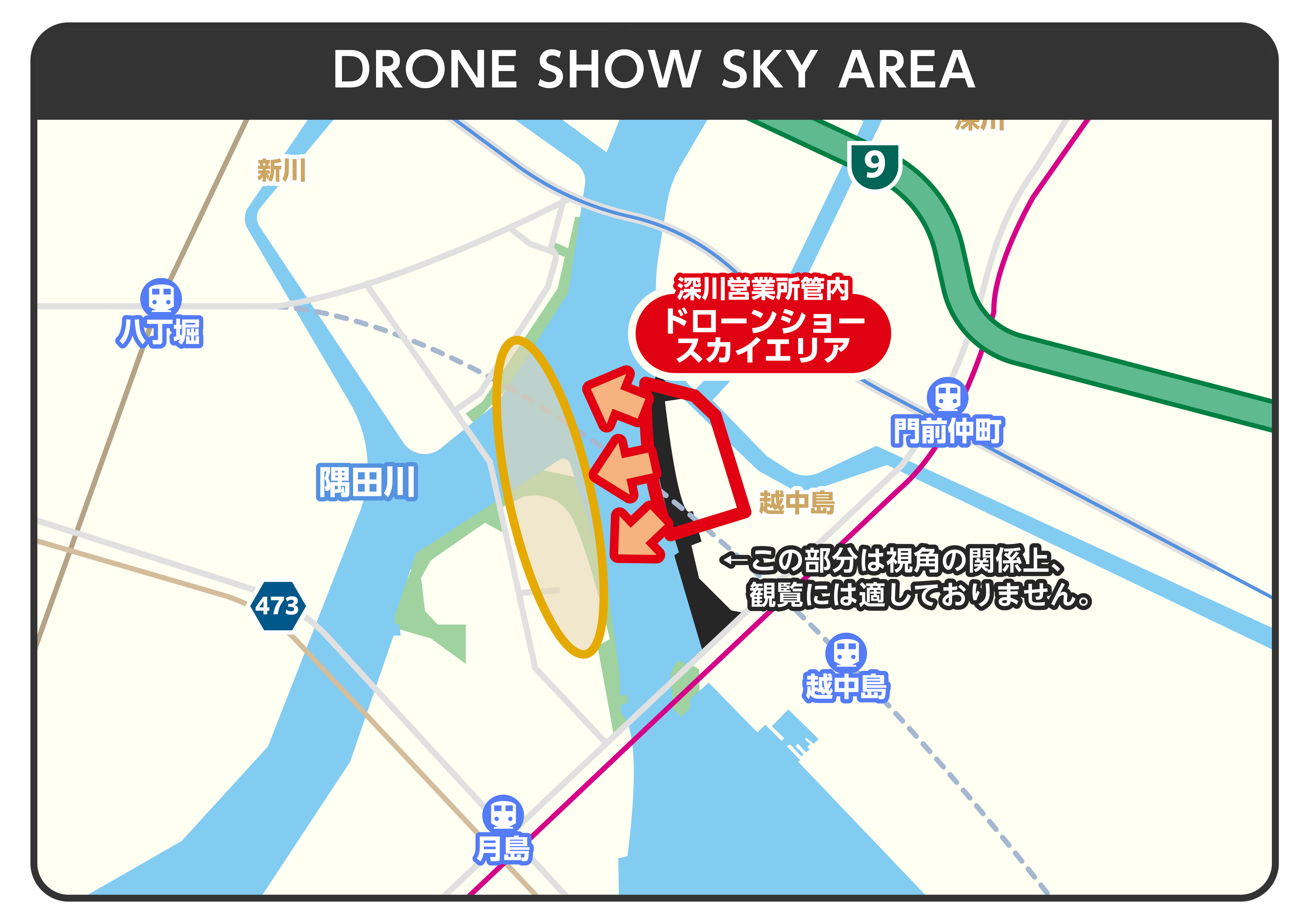 ※大島川水門テラス連絡橋から越中島公園を含む川沿いは、ドローンショースカイエリアとの視角の関係上、観覧には適しておりません。