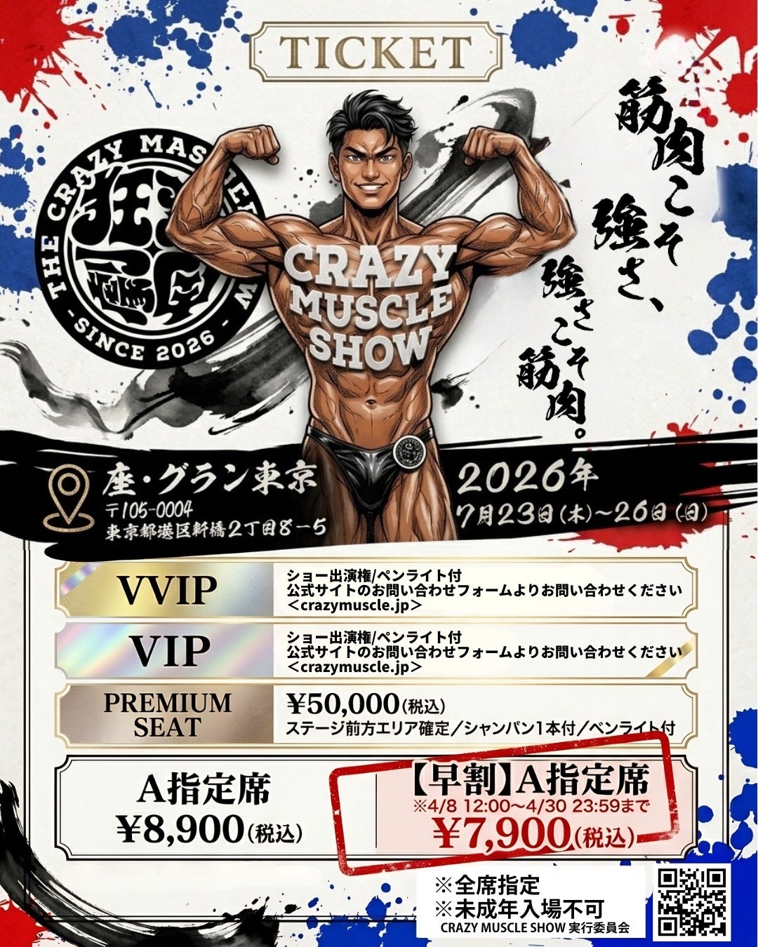 また、2026年4月8日(水)12時より、公式サイト(crazymuscle.jp)を公開し、併せて「チケット早割最速先行(チムチケ限定)」の販売を開始いたしました。