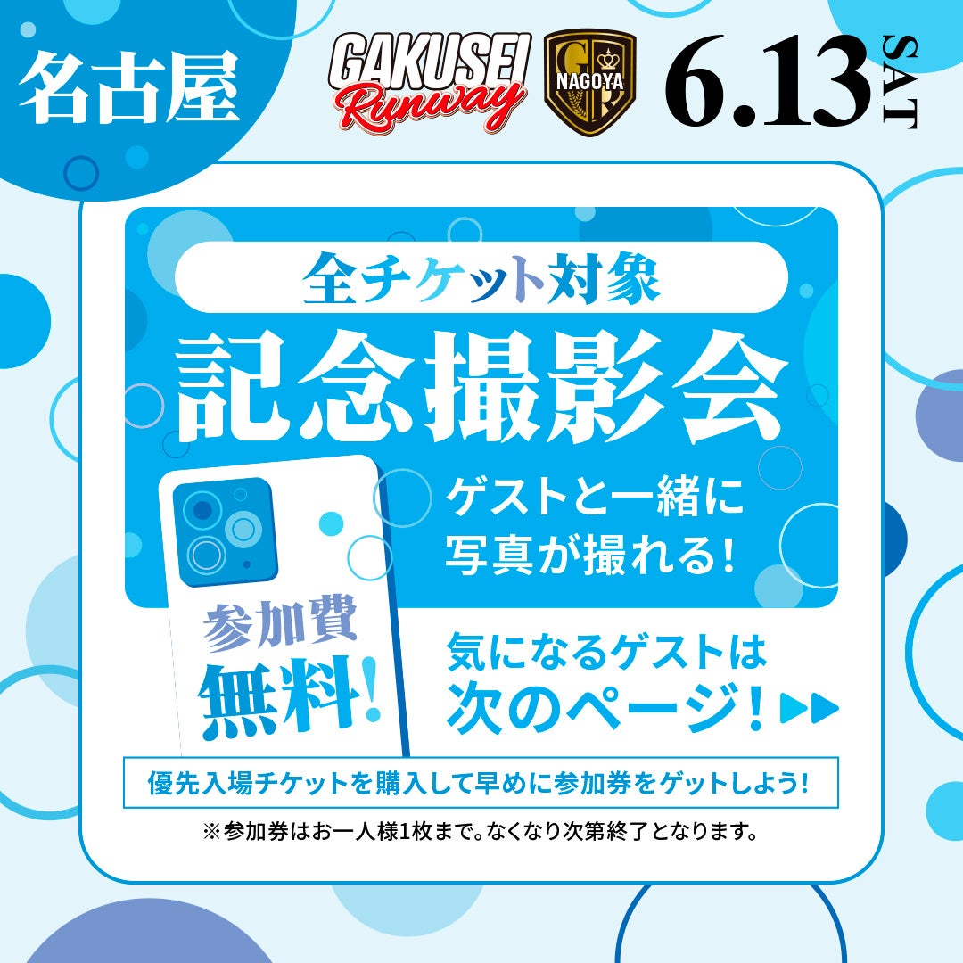大好評企画「記念撮影会」の開催が名古屋も決定!当日は豪華ゲストが登場し、来場者の皆様が先着で参加できる無料の記念撮影会を行います。憧れのゲストと近距離で写真が撮れる貴重なチャンスとなっており、大阪開催では長蛇の列ができるほどの盛り上がりでした。参加券はなくなり次第終了となりますので、是非お早めにご来場ください。(優先入場チケットをお持ちの方は通常の入場時間より30分早くご入場いただけます。)