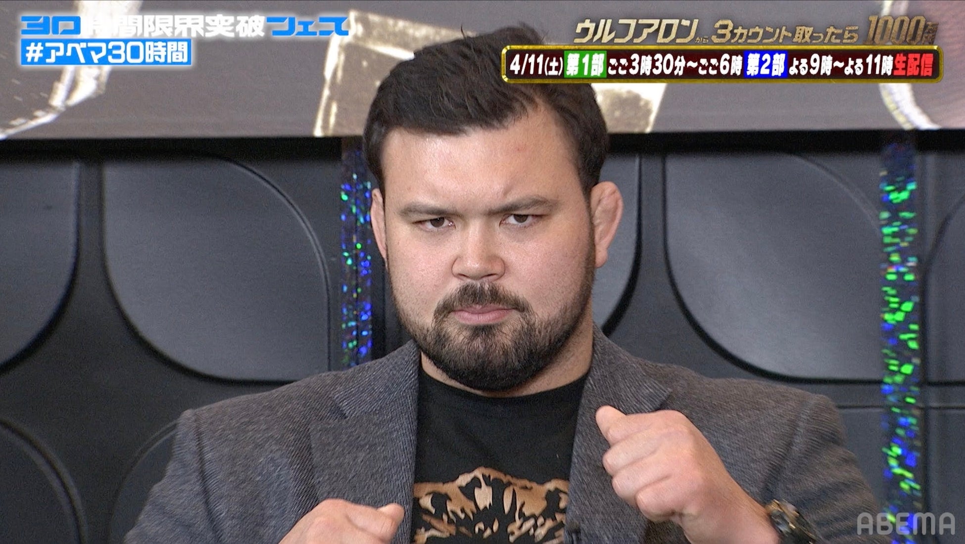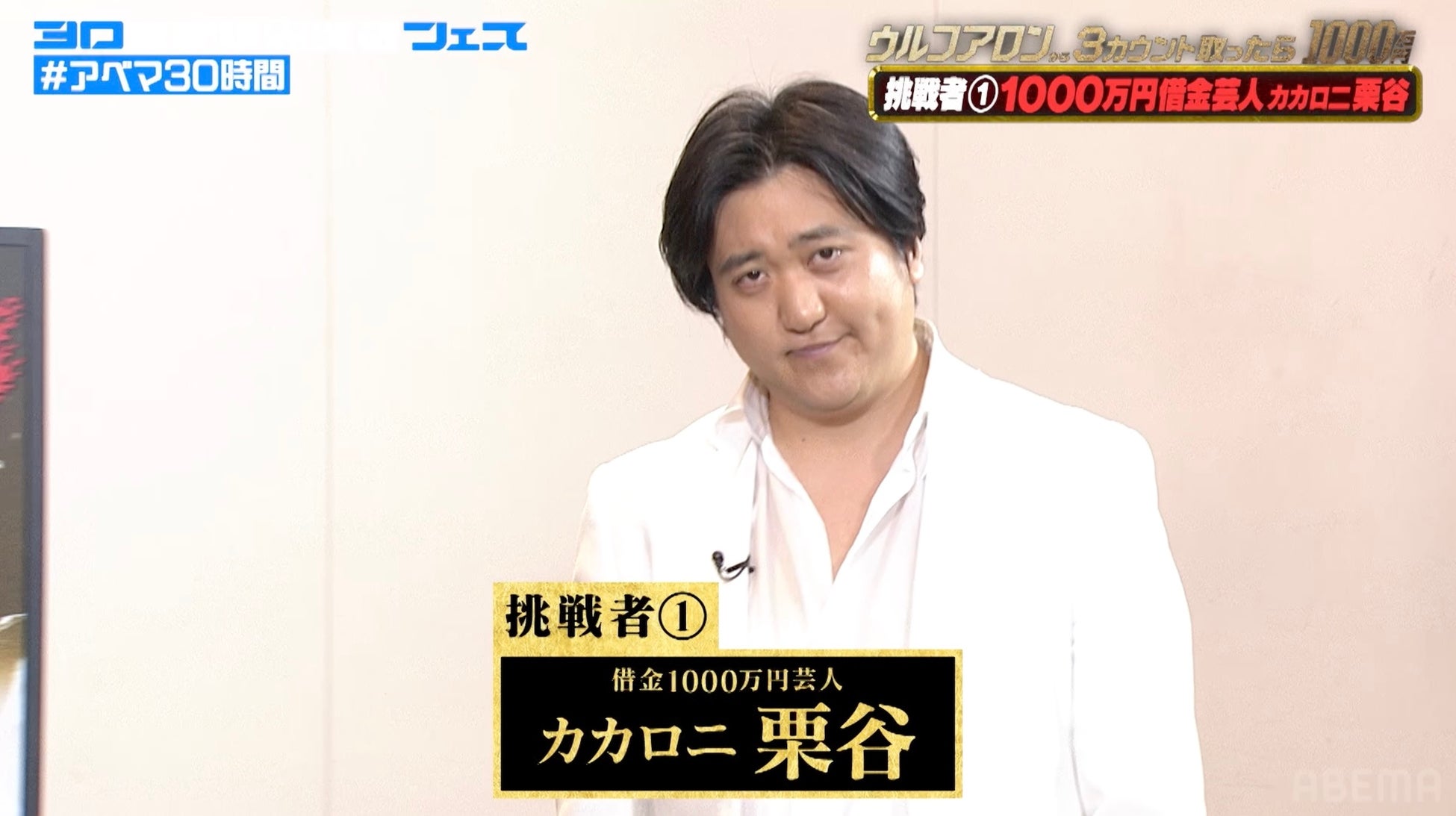 新しい未来のテレビ「ABEMA(アベマ)」は、2026年4月11日(土)に開局10周年を迎えます。そして「ABEMA」10周年を記念し、4月11日(土)午後3時から12日(日)夜10時にわたり、特別番組『30時間限界突破フェス』を生放送。本番組の目玉企画として、「1000万円シリーズ」の最新作となる『ウルフアロンから3カウント取ったら1000万円』を放送いたします。このたび、4月10日(金)夜7時より、特別番組『ウルフアロンから3カウント取ったら1000万円 調印式』を放送いたしました。