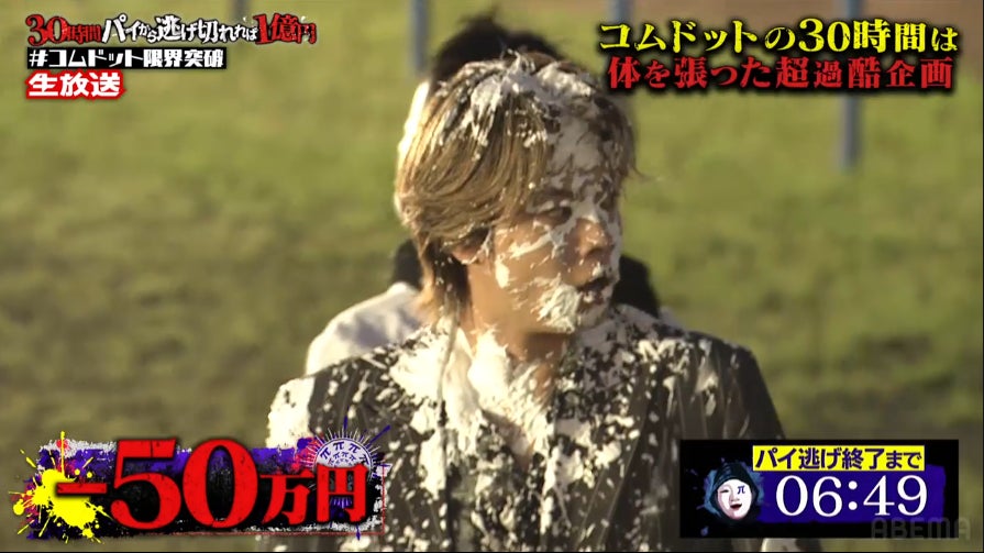 さらに、メンバーそれぞれがカタカナ一文字の記されたサイコロを持ち、10分という制限時間内に5人の出目を揃えて「コムドット」の完成を目指す、「コムドットサイコロ」や、視聴者からのコメントをヒントに正解を導き出す「他人任せクイズ」など、チームワークと運が試されるミッションに次々と挑戦。しかし、一筋縄ではいかない難関企画の数々に失敗が重なると、その度に容赦なくパイが投げられ、1億円の賞金が刻々と減額されていく展開となりました。波乱の展開でスタートを切った本番組。果たしてコムドットの5人は、次々と襲いかかるミッションを攻略し、いくらの賞金を残すことができるのか。