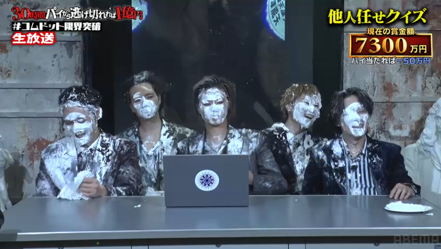 さらに、メンバーそれぞれがカタカナ一文字の記されたサイコロを持ち、10分という制限時間内に5人の出目を揃えて「コムドット」の完成を目指す、「コムドットサイコロ」や、視聴者からのコメントをヒントに正解を導き出す「他人任せクイズ」など、チームワークと運が試されるミッションに次々と挑戦。しかし、一筋縄ではいかない難関企画の数々に失敗が重なると、その度に容赦なくパイが投げられ、1億円の賞金が刻々と減額されていく展開となりました。波乱の展開でスタートを切った本番組。果たしてコムドットの5人は、次々と襲いかかるミッションを攻略し、いくらの賞金を残すことができるのか。