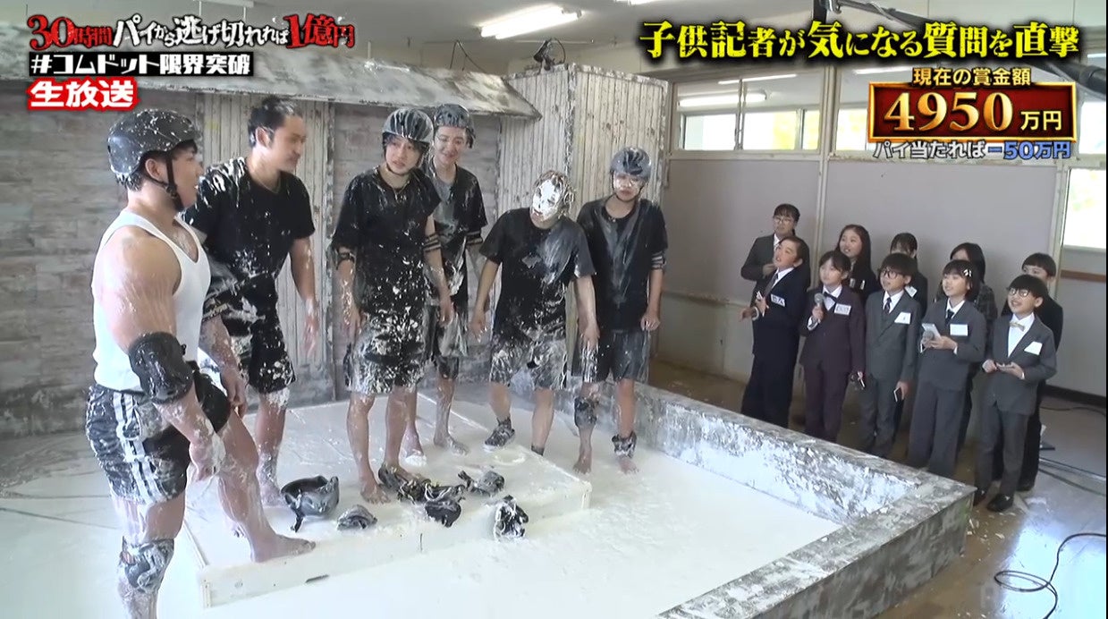 続いて一行は、ボディビルダーの横川尚隆が待ち構える部屋へ。ここでは指示された箇所以外が地面につくと大量のパイを浴びる「ツイスターゲーム」に挑戦。30ターン継続できなければ全員にパイの滝が降り注ぐという過酷なルールのもとミッションが開始されました。サークルマットの上で四苦八苦し、メンバーから「しんどい」と絶叫が漏れるほどの激闘を見せましたが、最後30ターン目、膝が付いてしまい失敗。頭上から降り注いだ大量のパイの滝により、メンバーは一瞬にしてパイまみれとなりました。