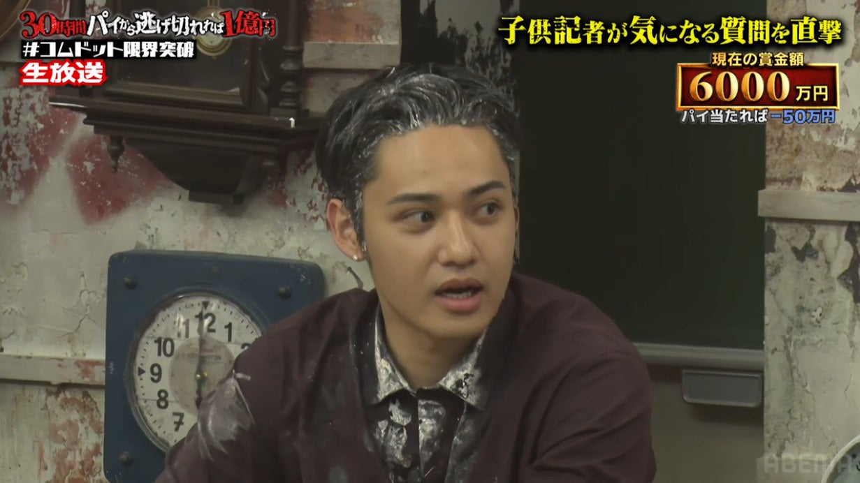 続いて一行は、ボディビルダーの横川尚隆が待ち構える部屋へ。ここでは指示された箇所以外が地面につくと大量のパイを浴びる「ツイスターゲーム」に挑戦。30ターン継続できなければ全員にパイの滝が降り注ぐという過酷なルールのもとミッションが開始されました。サークルマットの上で四苦八苦し、メンバーから「しんどい」と絶叫が漏れるほどの激闘を見せましたが、最後30ターン目、膝が付いてしまい失敗。頭上から降り注いだ大量のパイの滝により、メンバーは一瞬にしてパイまみれとなりました。