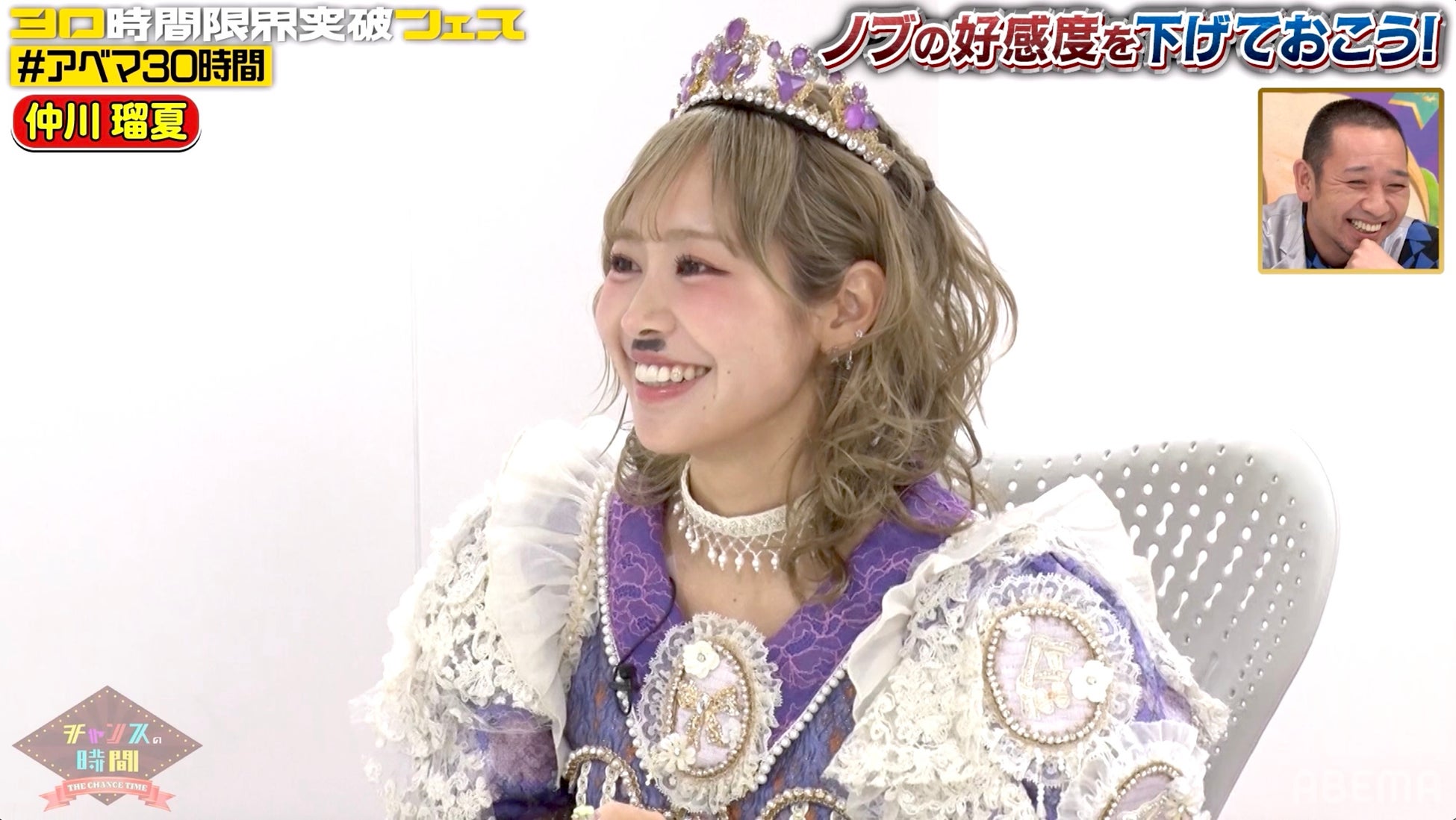 『30時間限界突破フェス』内にて放送した『「チャンスの時間」ノブの好感度を下げておこう30時間フェスver.』は、ノブが不祥事を起こす前に、上がりすぎた好感度をあらかじめ下げて不測の事態に備える『チャンスの時間』の人気企画です。大悟の指示で“イヤな奴”になりきったノブが、楽屋挨拶に訪れるゲストに対して“好感度落下チャレンジ”を行い、今回、相手役として大人気アイドルグループ・FRUITS ZIPPERの仲川瑠夏と、俳優・山本裕典が登場しました。