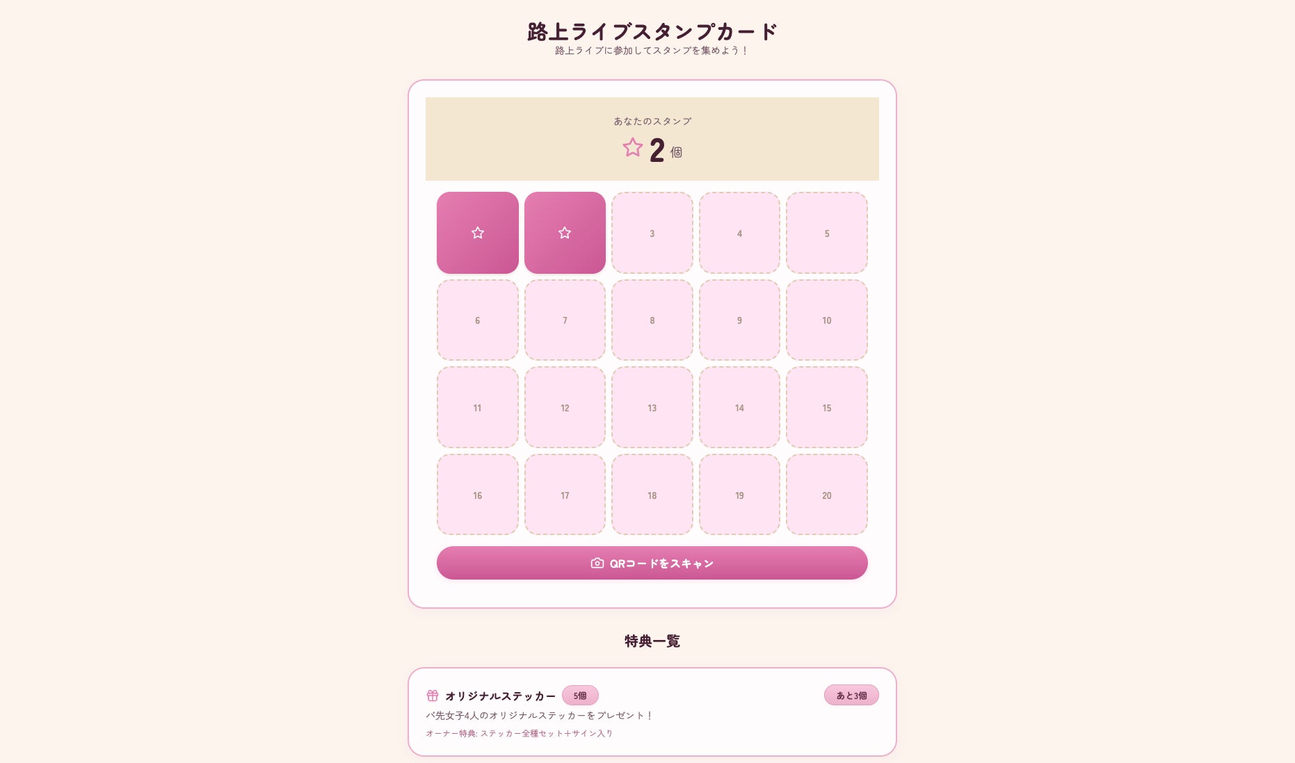 メンバーの路上ライブに参加するとスタンプが貯まる、リアルイベント連動型の特典システムです。