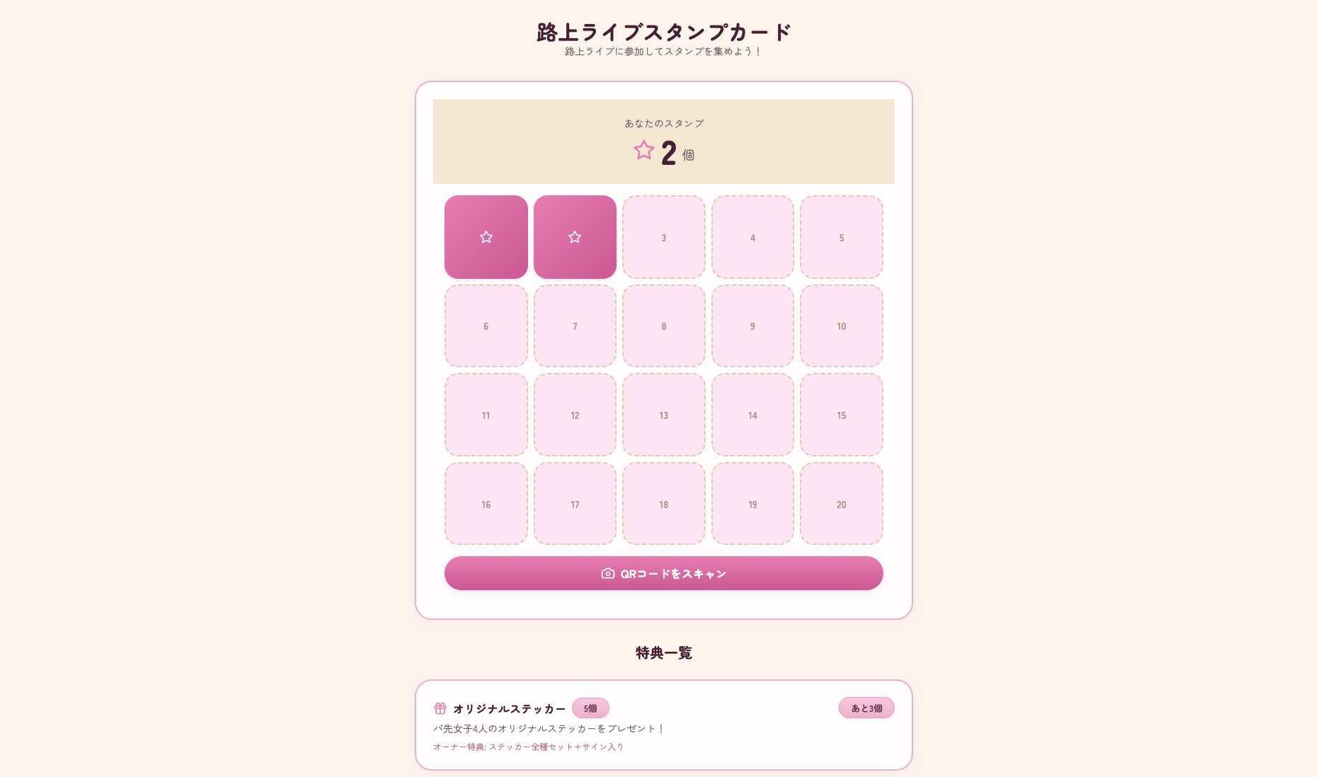 メンバーの路上ライブに参加するとスタンプが貯まる、リアルイベント連動型の特典システムです。