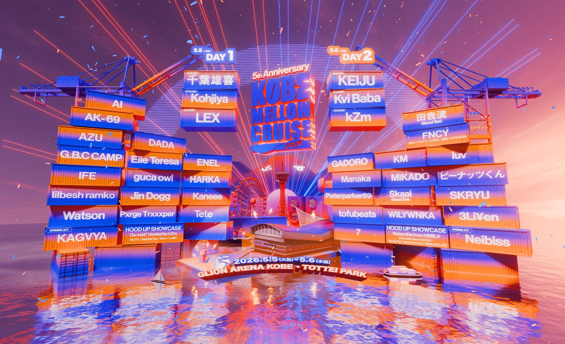 2022年より神戸で開催されている都市型野外音楽フェス「KOBE MELLOW CRUISE」。海風を感じながら、最先端のヒップホップやR&Bを堪能できるだけでなく、ファッションやアート、フードなどの多様なカルチャーが融合したフェスです。開催5周年となる今年は5月5日(火・祝)・5月6日(水・祝)神戸の新ランドマーク「GLION ARENA KOBE/TOTTEI PARK」で開催されます。モンスターエナジーもドリンクパートナー5周年目として、今年も「KOBE MELLOW CRUISE」を盛り上げます。