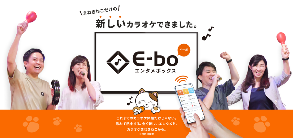 『E-bo』は、カラオケまねきねこが独自に開発・提供するオリジナルカラオケ機種です。アーティスト本人が演奏・録音した”原盤音源”を使用できる「本人音源」機能をはじめ、歌唱によるポイント獲得、ミッション挑戦など、ゲーム感覚で楽しめる機能を多数搭載しています。さらに、外部パートナー企業が提供するコンテンツを『E-bo』を通じて購入・体験して楽しめる機能も備えており、カラオケボックスを単なる「歌う場」から、次世代のエンタメボックスへと進化させます。