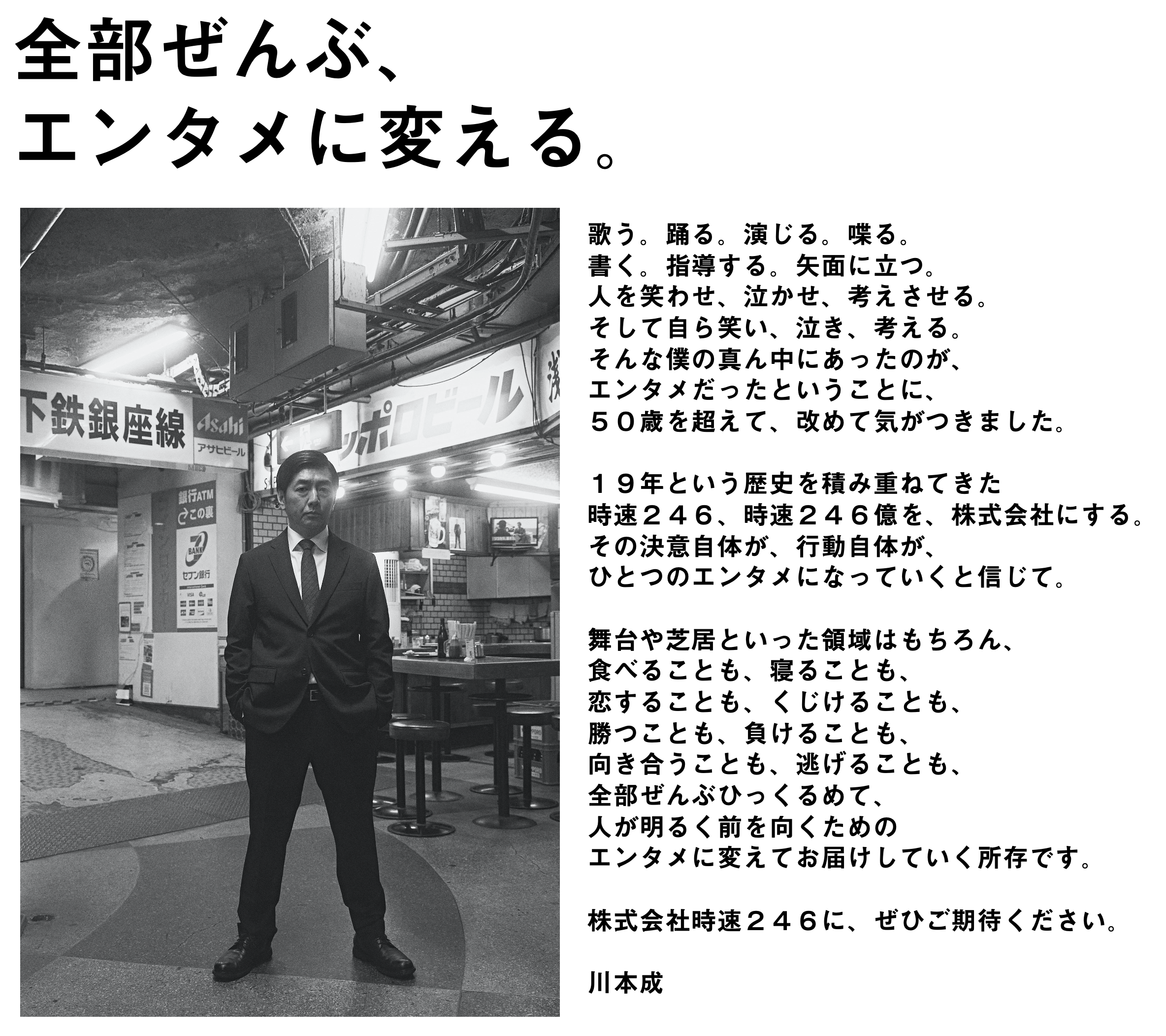 この度、数々の舞台公演を企画・プロデュースしてきた「時速246」が法人化いたしましたので、ここにお知らせいたします。また、代表取締役社長には川本成が就任しましたことをあわせてご報告いたします。