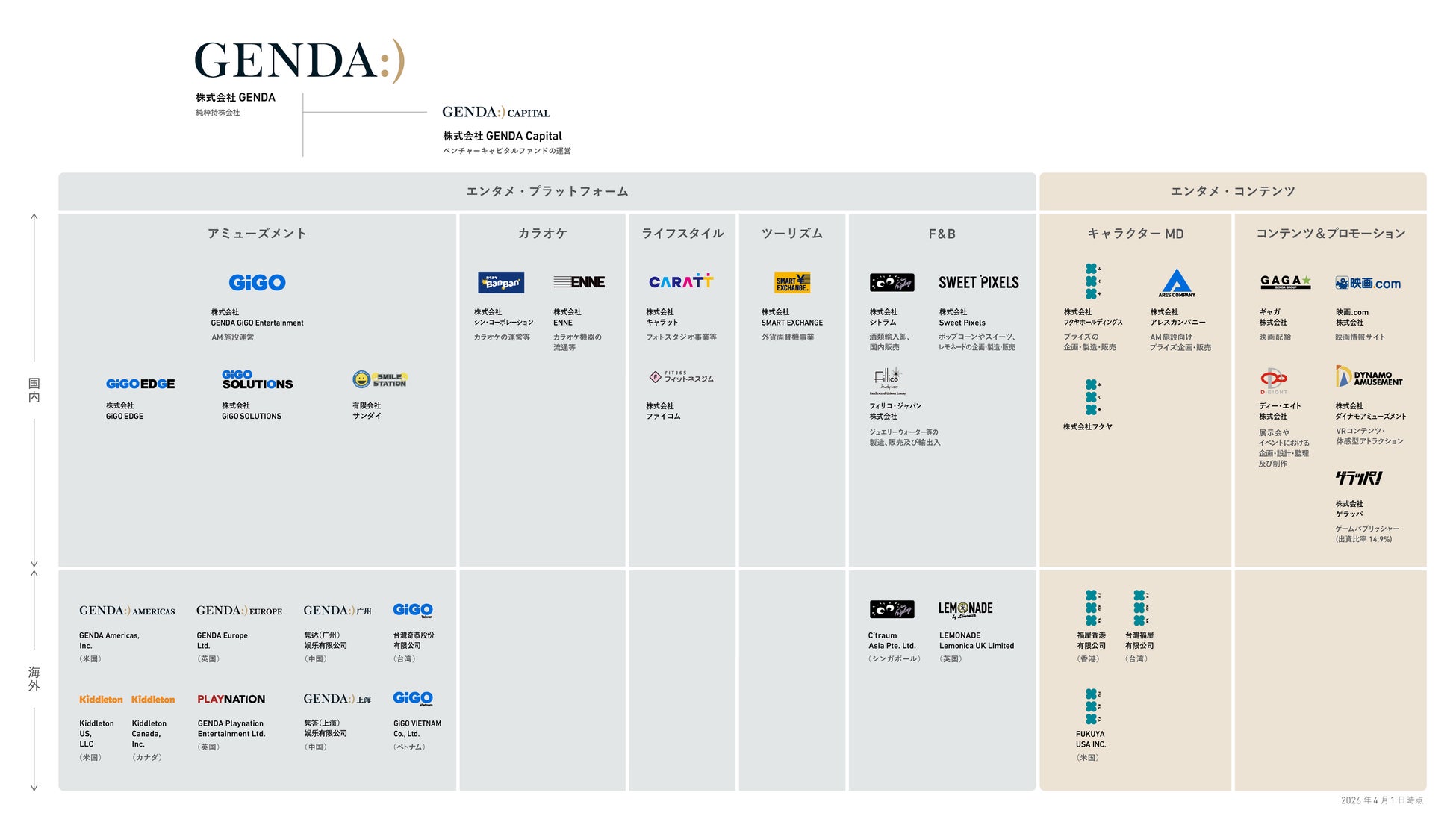 アミューズメント、カラオケ、ライフスタイル、ツーリズム、フード&ビバレッジ、キャラクター・マーチャンダイジング、コンテンツ&プロモーション(映画や体験型コンテンツ等)などエンターテイメントにおいて幅広く事業を展開しています。国内外で「GiGO」等のアミューズメント施設やカラオケチェーン店「カラオケBanBan」、フォトスタジオ「スタジオキャラット」等を合わせて約1,100店舗、ミニロケ(主に30台以下のゲーム機を設置するゲームコーナー)を約13,000箇所運営しています。日本、米国、カナダ、英国、アイルランド、オランダ、中国大陸、香港、台湾、シンガポール、ベトナム等の地域において事業展開しております。
