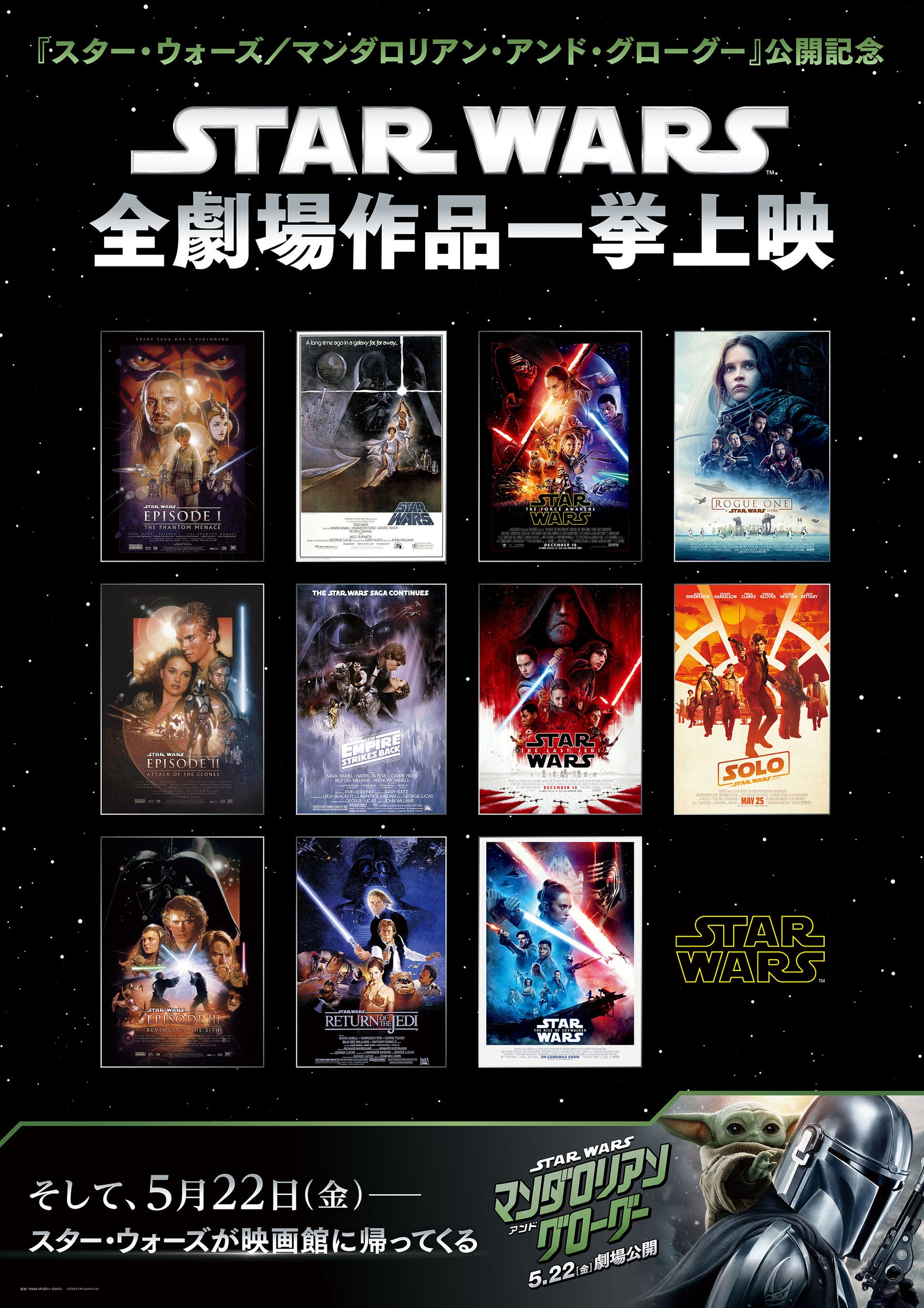 クロージングイベントの「スター・ウォーズ」の全シリーズをTHXで上映では、エピソード1から海老名で「スター・ウォーズ」を観ていただいている方、最後だからこそ“スター・ウォーズの聖地”ともいわれるイオンシネマ海老名で鑑賞したい方、お子さまと一緒に再びあの感動を味わいたい方など、幅広いファンの方々にお楽しみいただける内容をご用意しています。また、イオン海老名店でも“海老名「スター・ウォーズ」ロード”と称し、ショッピングセンター内の装飾や関連商品の販売を4月24日(金)より予定しており、共同で「スター・ウォーズ」を盛り上げます。スター・ウォーズシリーズ待望の最新作『スター・ウォーズ/マンダロリアン・アンド・グローグー』(5月22日(金)公開)のキャラクターたちも「海老名スター・ウォーズロード」に登場します。イオンシネマ海老名での上映はありませんが、スター・ウォーズの興奮を他の劇場へ繋いでまいります。
