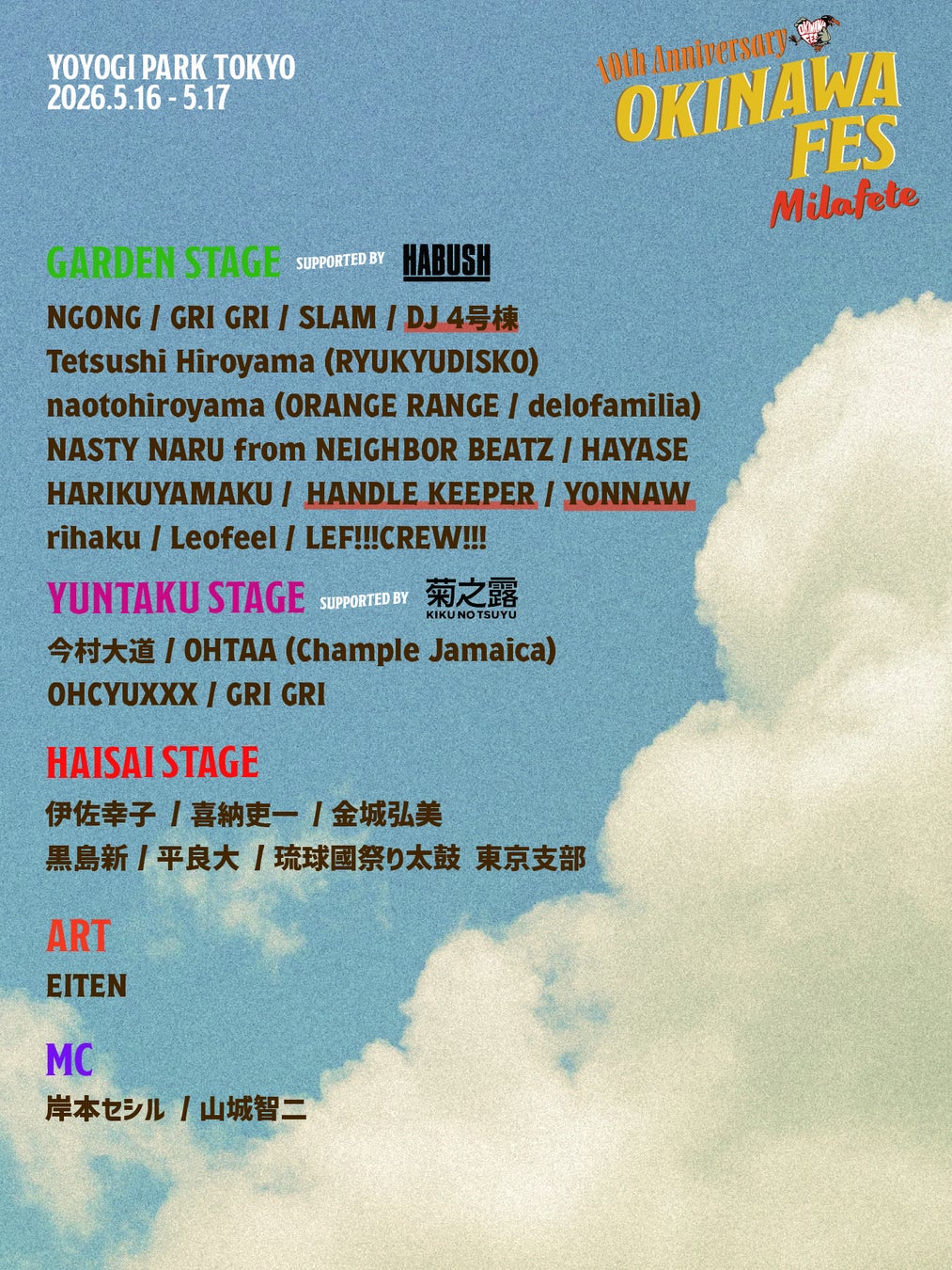 ミラフェート株式会社(所在地:沖縄県那覇市、代表取締役:笠井誉⽂)は、通算11回⽬、10周年を迎える「OKINAWA FES Milafete(オキナワフェス ミラフェート)」において、2026年5⽉16⽇(⼟)・17⽇(⽇)の2⽇間、東京都・代々⽊公園イベント広場にて開催される本イベントの全出演アーティストの発表を⾏ったことをお知らせいたします。