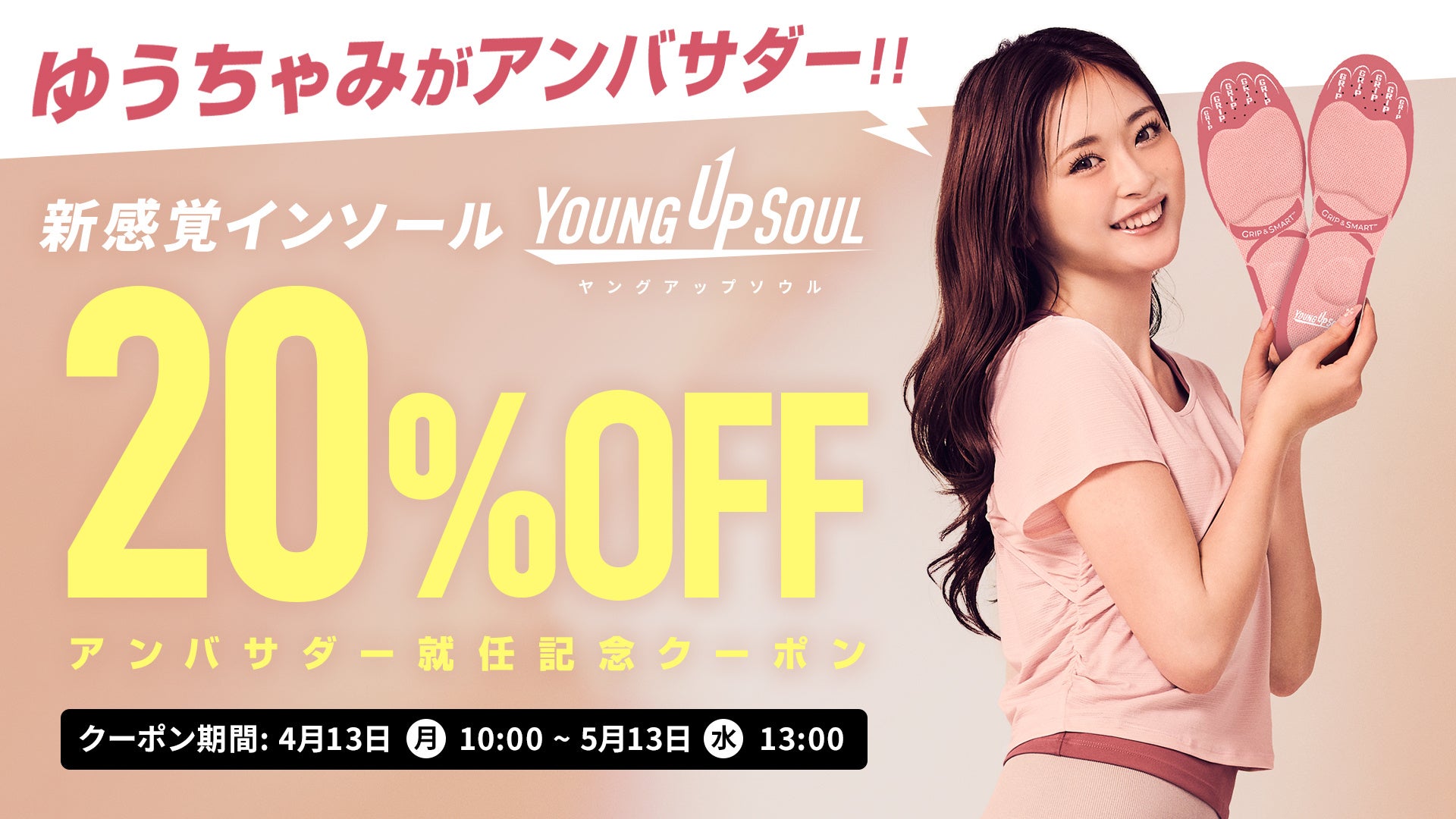 ゆうちゃみのアンバサダー就任を記念して、YOUNG UP SOUL(ヤングアップソウル)公式ECサイトでインソールに使える期間限定20%OFFクーポンが配布されます。