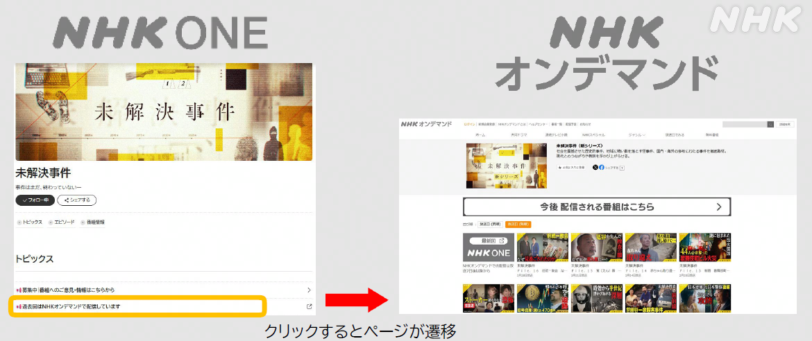 「NHK ONE」と「NHK オンデマンド」の連携を強化していきます。放送から1週間が経過し、「NHK ONE」の見逃し配信が終了した番組について、「NHK ONE」の番組HPから、「NHK オンデマンド」の当該番組のページへ簡単に移動できる導線の整備を、今春から順次開始しています。(※2)