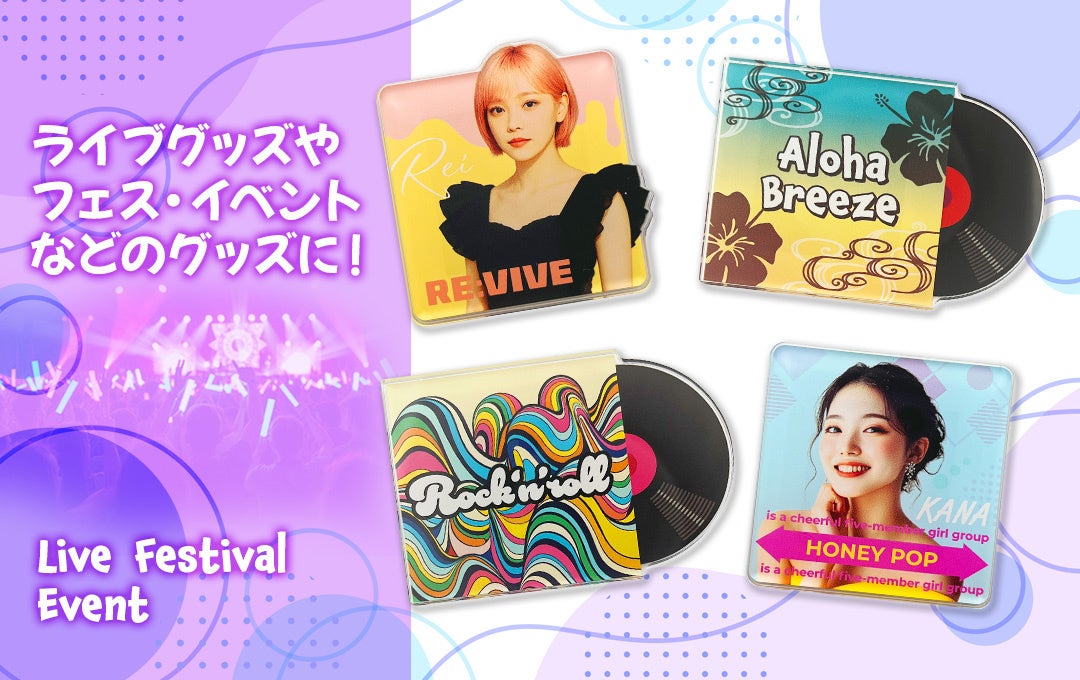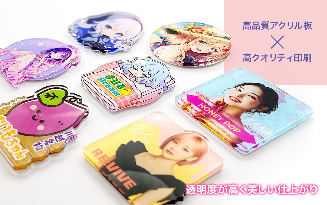 アクリル部分はダイカット加工に対応しており、丸型・四角型はもちろん、自由な形状での制作も可能。販売用グッズや企業ノベルティ、記念品、同人グッズなど、幅広いシーンで活用できる実用的なアイテムです。国内生産・小ロット対応のため、オリジナル商品を検討中の方にも導入しやすい仕様となっています。