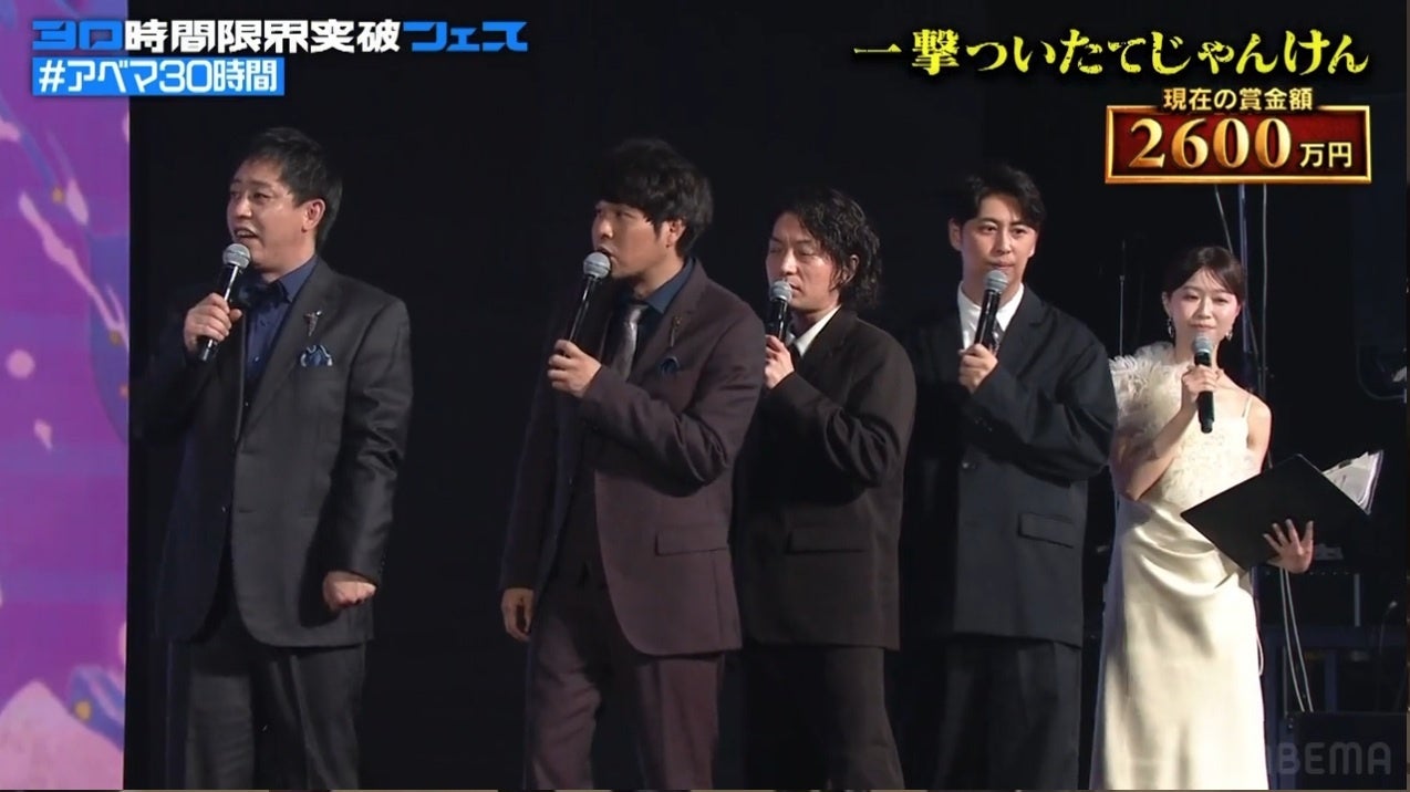 過酷なミッションの連続で賞金が減額されていく中、この時点でコムドットに残された賞金は2600万円。ステージ上では、グランドフィナーレを飾る最後の企画「一撃ついたてじゃんけん」のルールが説明されました。コムドットの代表者1人と芸人チームの対戦相手がついたて越しに一発勝負のじゃんけんを行うという究極の心理戦。1分間であれば出した手を変えることが可能ですが、勝てば賞金2600万円を全額獲得、負ければ0円となってしまいます。さらに芸人チームが勝った場合、賞金100万円を芸人チームも獲得できるというルールが明かされました。