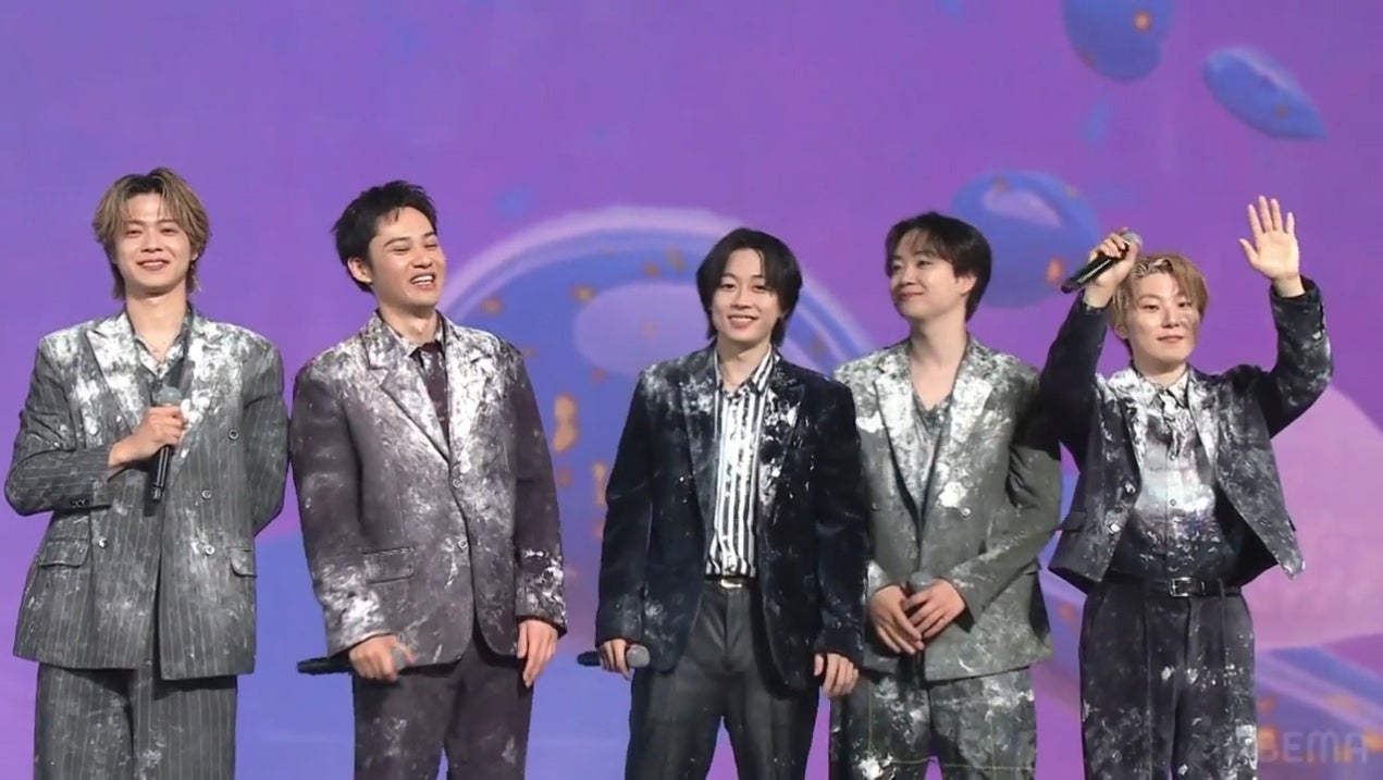 バスから降り立ち、ぴあアリーナに到着したコムドットのメンバーたちは、集まったファンに手を振って応えました。会場では、30時間の激闘の中で179回ものパイを浴びたコムドットの軌跡を振り返る映像が映し出され「すごいねー!」「かっこいいな」と感嘆の声が上がりました。ステージには西澤アナウンサーをはじめ、お笑いコンビのニューヨーク、さらば青春の光がMCとして登壇。西澤アナの「後方にご注目ください!」という呼び込みに合わせてコムドットが入場し、ステージに向けて歩みを進めると、芸人たちから「お疲れ様でした!!」と熱い労いの言葉がかけられました。さらば青春の光・森田から過酷な挑戦の感想を聞かれたゆうたは、「体がくさいっすね…」と激闘の爪痕を語り、一番きつかった企画としてひゅうがは「初っ端の鬼ごっこ」と答えました。