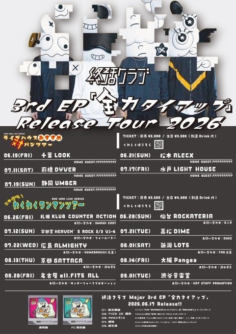 先日Major 3rd EP「全力タイアップ」を6/17(水)にリリースすることも発表し、バンド史上最大の挑戦となる5月24日(日)初の恵比寿LIQUIDROOMワンマン、今週末から始まる「えんせいがんぼう」と題した全7公演の全国ツアーの開催と、勢いが止まらない終活クラブの活動に引き続き注目したい!