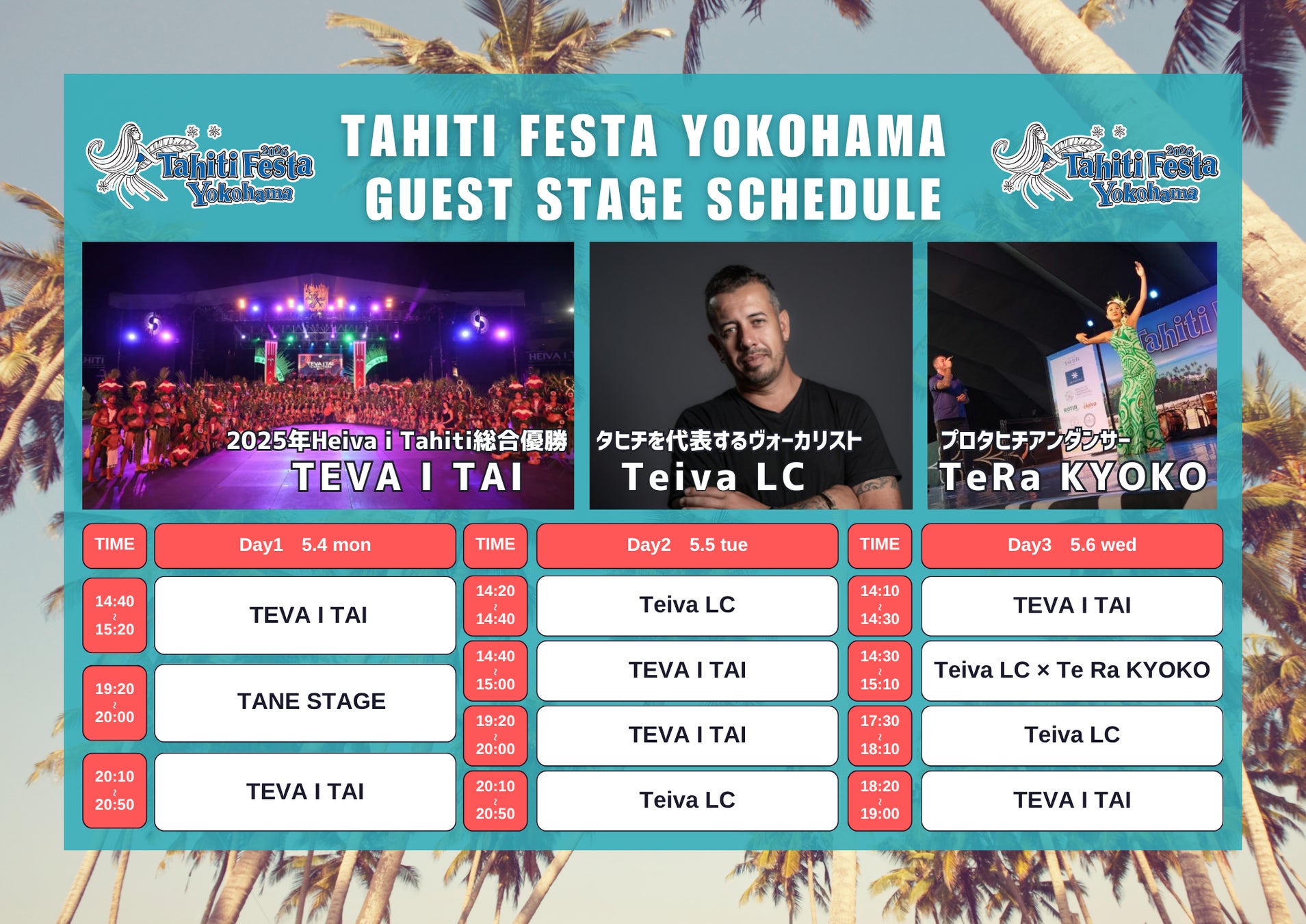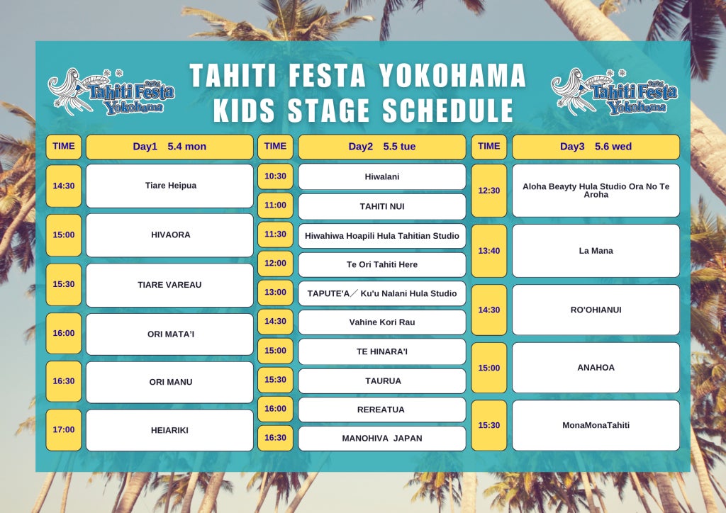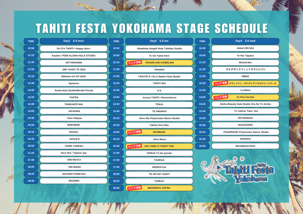 日本国内においてタヒチ全般のプロモーションを行っている株式会社タヒチプロモーション(代表取締役:大石 暢)は、2026年5月4日(月祝)~6日(水祝)の3日間「Tahiti Festa 2026 Yokohama」を開催します。2025年は3万人以上が来場し多くのお客様に楽園タヒチの文化・食・音楽・ダンスをお楽しみいただきました。今年はHeiva I Tahiti 2025総合優勝のタヒチNo.1のダンスグループTEVA I TAI(テヴァ イ タイ)のゲスト出演が決定!タヒチを代表するヴォーカリストのステージをはじめ、国内有数のタヒチアンダンスグループによる圧巻のステージ、現地から来日の職人による伝統工芸品からタヒチ直輸入商品の販売を行うなど、子どもから大人まで楽園タヒチの雰囲気を楽しめる⼊場無料のイベントです。