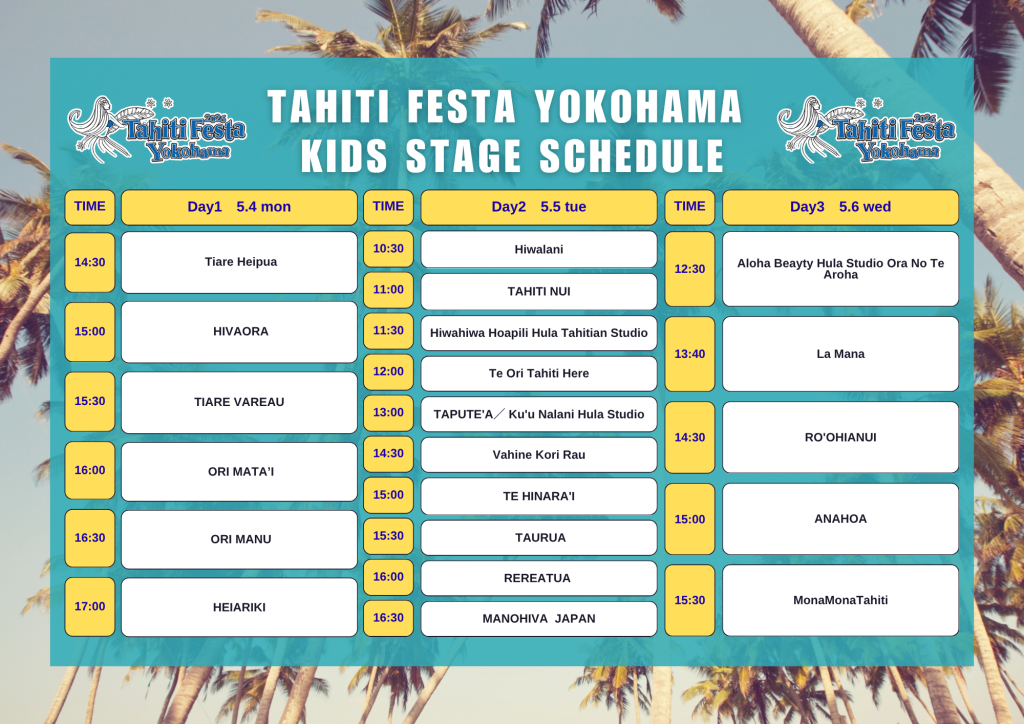 日本国内で活躍するタヒチアンダンスグループが迫力のステージをお届けします。関東を中心に昨年を超える「56組・約1300名を超えるタヒチアンダンサーが参加。昨年大好評の生演奏でのステージもパワーアップ!さらにエントランスのミニステージでは3日間キッズステージも開催決定!迫力溢れるステージをお楽しみいただけます。