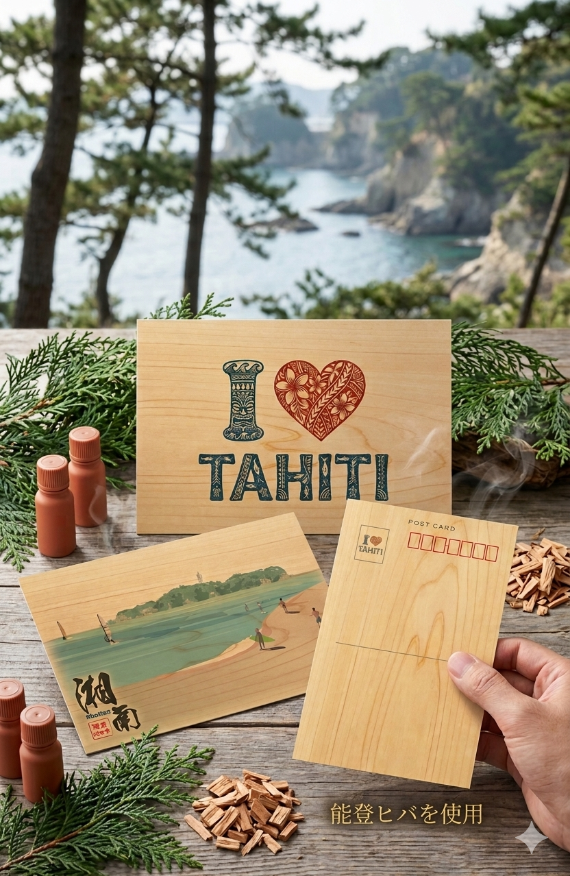 藤沢市にあります就労継続支援B型施設「リハスワーク藤沢」です。今回は横浜大さん橋に、タヒチの風と能登ヒバの温もりが融合した特別なコレクションをお持ちいたします。 POPな中にも緻密なトライバルデザインを刻んだ、圧倒的な存在感を放つ速乾性ドライTシャツとトートバッグ。 さらに、爽やかに香る能登ヒバのハガキやしおりが、日常にリラックスを届けます。 機能美と伝統が響き合う、今だけの「持ち歩けるアート」をその手に。