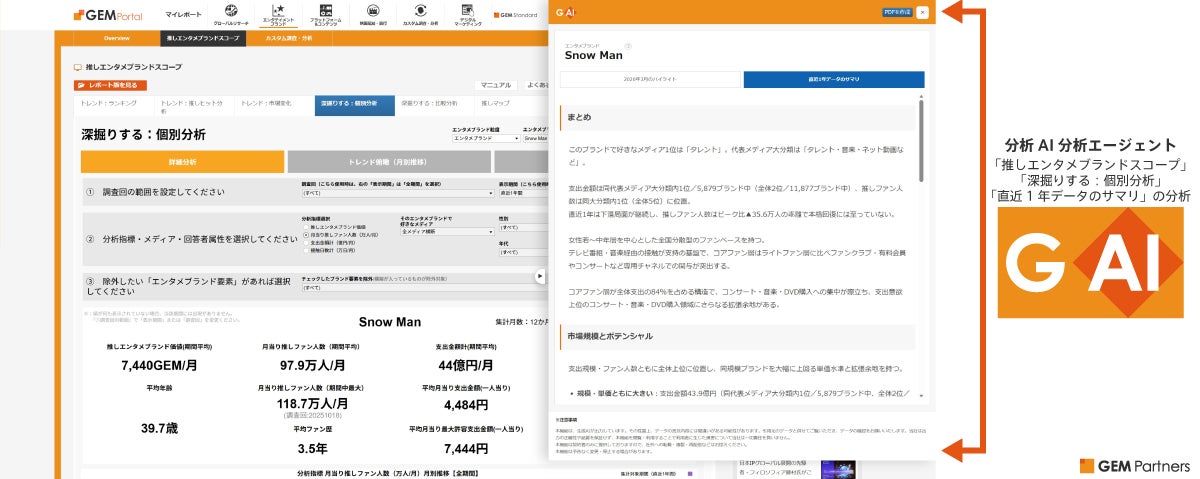 エンタテイメント業界に向けたデータ×デジタルマーケティングサービスを提供するGEM Partners株式会社(ジェムパートナーズ、所在地:東京都港区、代表取締役:梅津文)は4月17日(金)、推されているエンタメブランドとそのファンを理解し、次のヒットを見いだすオンラインダッシュボード「推しエンタメブランドスコープ」に、業界特化型の分析AIエージェント「GAI(ガイ)」を導入いたします。「GAI」は、膨大な推しファンデータの動向を自動で分析してサマライズ。これまで手作業で行っていた分析工数を大幅に削減し、より高度な戦略立案への注力を可能にします。