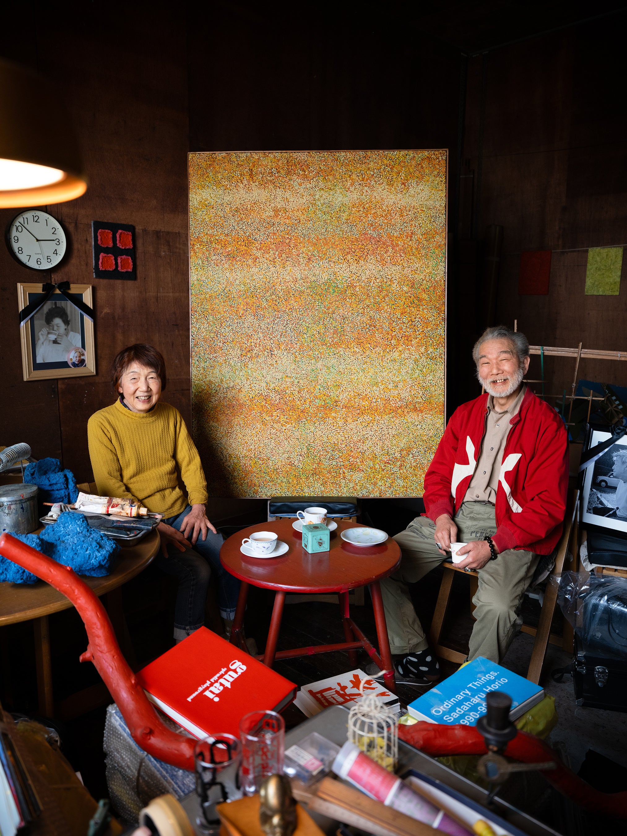 その後、神戸に移住し、32歳のときに見た吉原治良のクレパス画に強い印象を受け、師事し指導を受ける。具体美術協会の結成時から1972年に解散するまで在籍する。