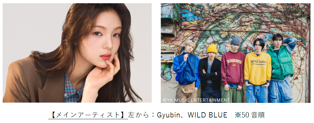 注目のメインアーティストには、等身大のリアルさとそれぞれが自由な色を持つ5人組ボーイズグループで、2024年9月にデビュー後、昨年4月に開催した全国ツアーは全公演SOLD OUT、グループ初のドラマ主題歌となった3rd Digital Single「Bubbles」はSpotifyのViral Chartsで2週連続1位を獲得し、今年には1stアルバム『CURVE』のリリースや初の全国ホールツアーを控えるなど、さらなる飛躍に期待が集まるWILD BLUEに加え、2024年1月にリリースされた『Really Like You』は、発表からわずか1か月で各国のSpotifyバイラルチャート1位を獲得し、さらに日本のApple MusicやLINE MUSICでも上位にランクインするなど人気を集め、リリースから約1か月半で累計再生回数100万回を突破。現在では韓国語版・英語版を合わせたSpotify累計再⽣数が3,500万回を超えるなど、異例の快挙を達成している今⼤注⽬の韓国出⾝アーティストGyubinTGC初出演が決定しました!