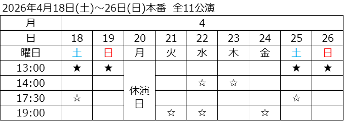 期間:2026年4月18日(土)~4月26日(日) 計11公演 ※開場時間は開演の45分前