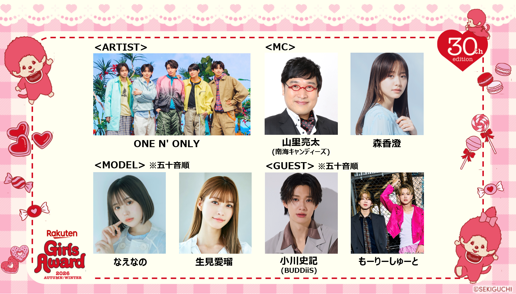 この度、イベントのキービジュアル・第1弾の豪華出演者を発表いたします。2010年の初開催から数え、今回でGirlsAwardは開催30回目を迎えます。これを記念して、大人気キャラクターモンチッチとのスペシャルコラボが実現!モンチッチは1974年に誕生し、発売と共に爆発的ブームを起こしたキャラクターで、近年若い世代にも大きな注目を集め、誕生50周年を迎えてもなお幅広い世代に愛され続けています。GirlsAwardも”時代を越えて愛される存在でありたい”という想いのもと、これまでにないGirlsAwardオリジナルカラーのモンチッチを取り入れた可愛らしい世界観のイベントキービジュアルでアニバーサリー回を彩ります。