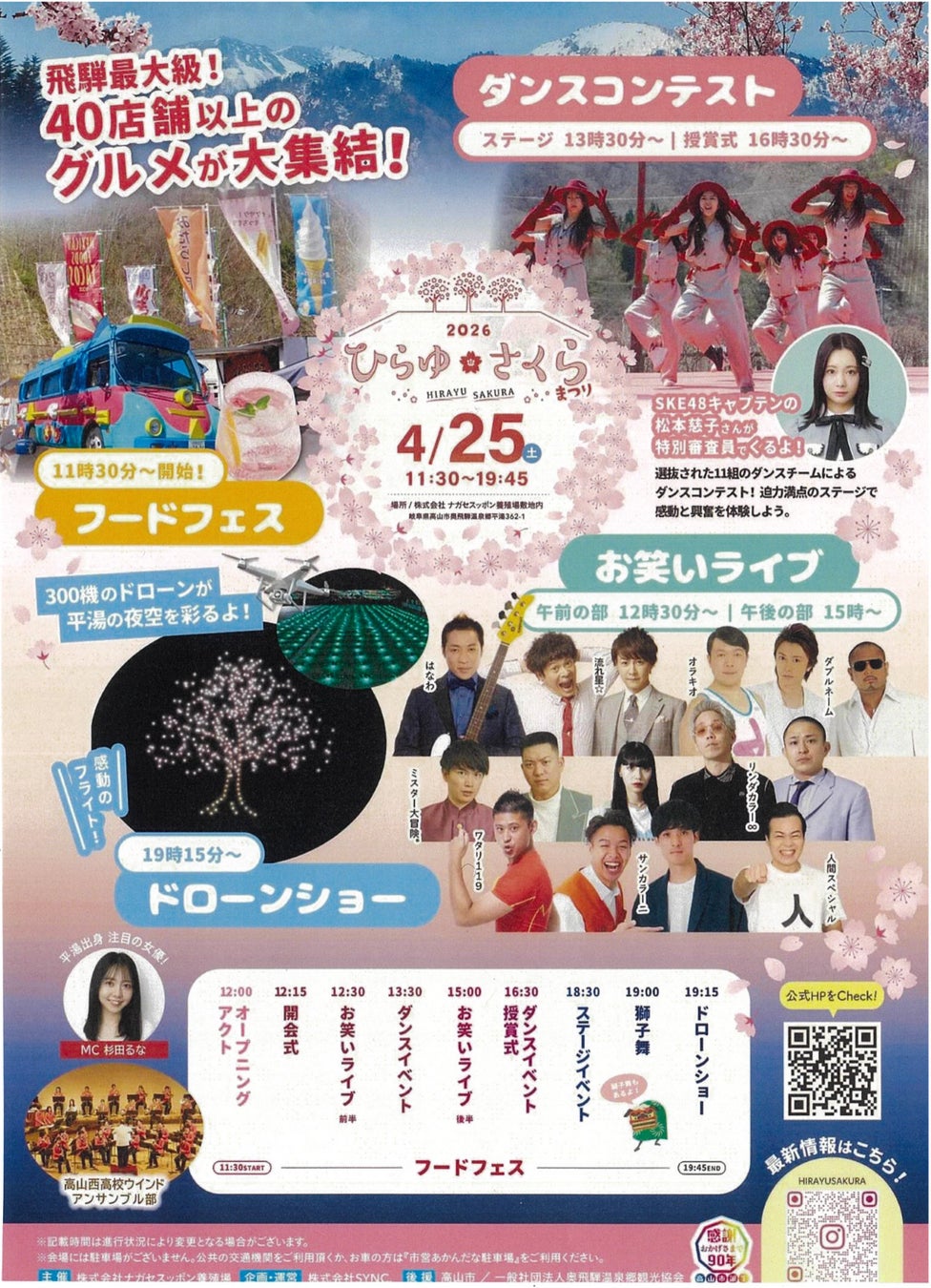 ひらゆさくら祭りとは、ナガセスッポン自慢のひらゆさくらを見ながら美濃飛騨観光大使である「流れ星☆」含め多数の芸人、タレントさんと皆さんで楽しむイベントです。