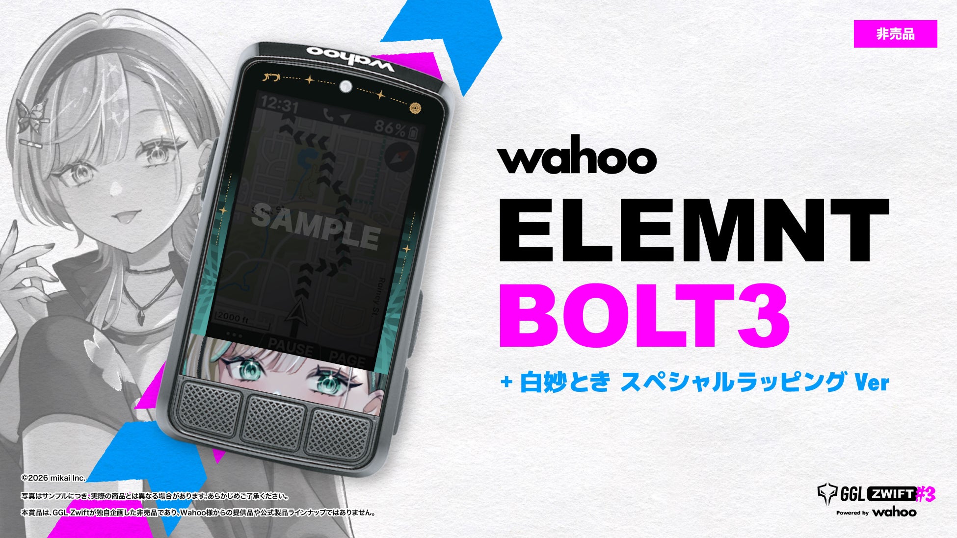 累計参加者数28,000人を超える国内最大級のeスポーツコミュニティ「GGL」は、バーチャルサイクリングアプリ「Zwift」を用いたeスポーツ大会「第3回GGL Zwift Powered by Wahoo」の特別企画として、人気VTuber「白妙とき(VRAID所属)」のオリジナルデザインを施した特別ラッピング仕様のサイクルコンピューターが抽選で当たるプレゼントキャンペーンを開始いたしました。