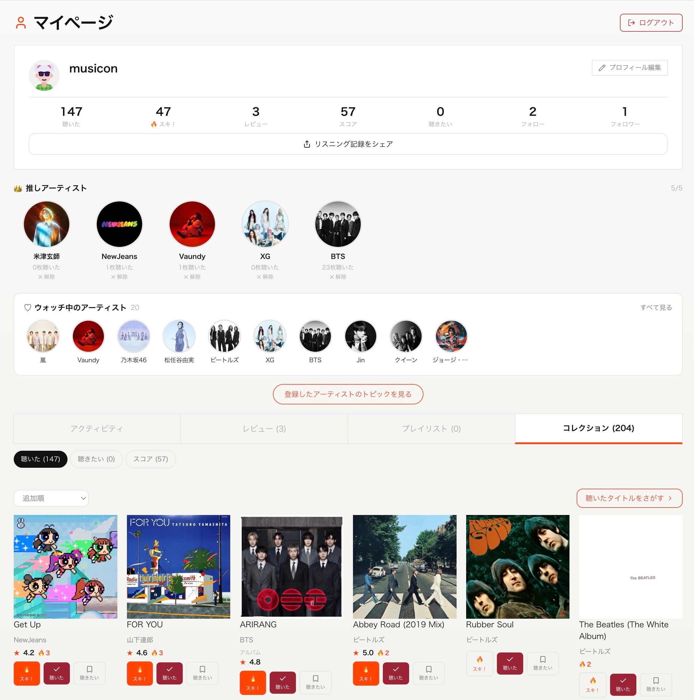 好きなアーティストを「ウォッチ」に登録すると、トップページがカスタマイズされ、そのアーティストに関する最新のレビューやスコアが自動で届きます。さらに「推し」に設定すれば、同じアーティストを推すユーザーの活動も表示されます。