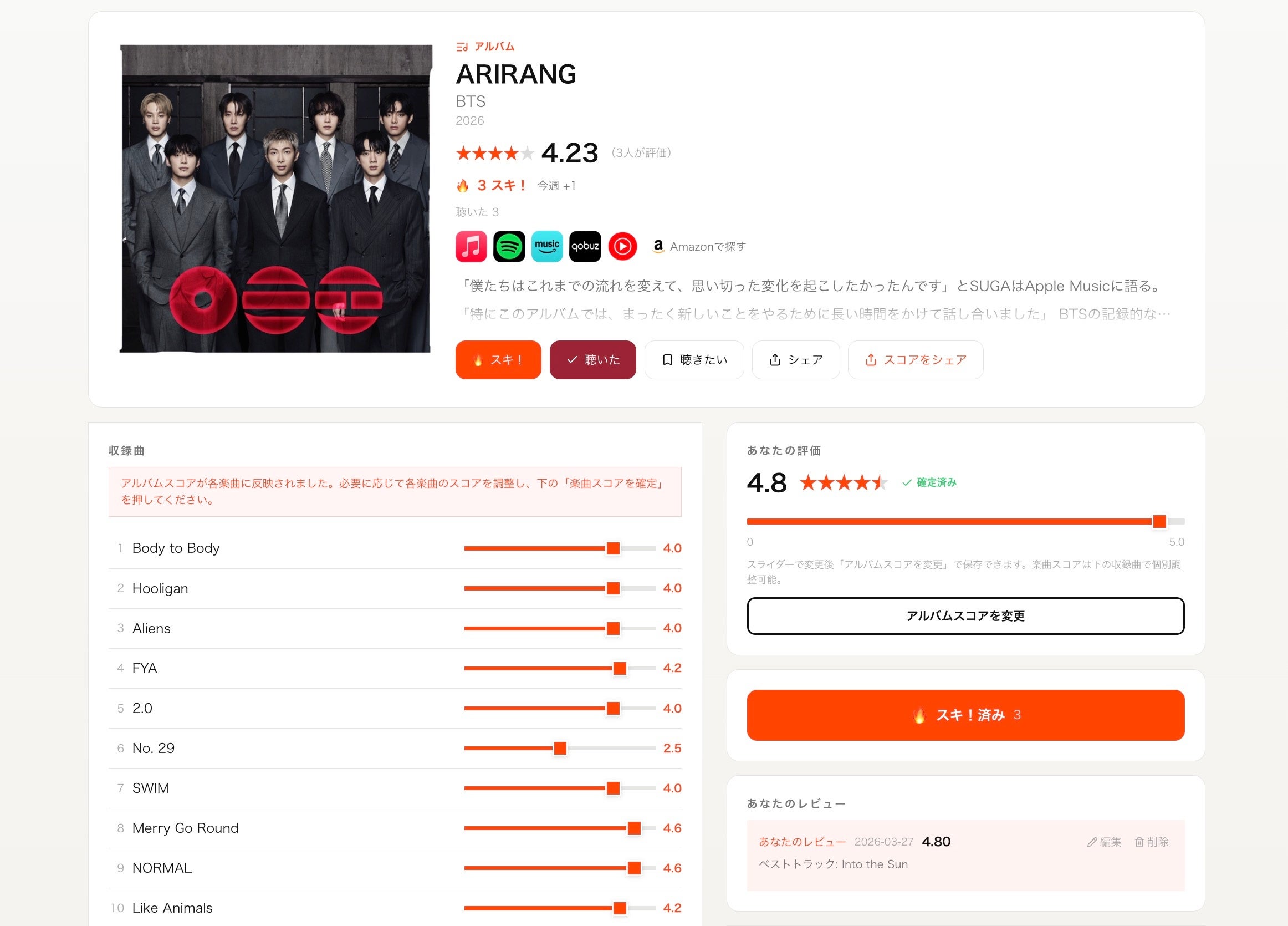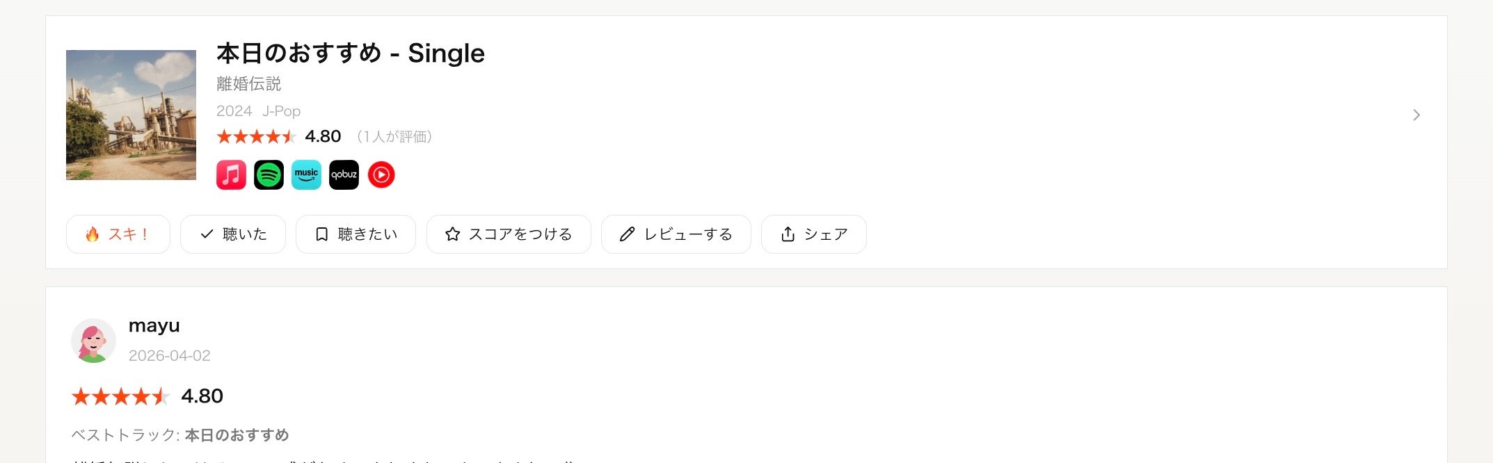 5点満点のスコアとフリーテキストで感想を残せます。楽曲単位のスコアリングにも対応。「なんとなく好き」を数字と言葉にすると、音楽の聴き方が変わります。