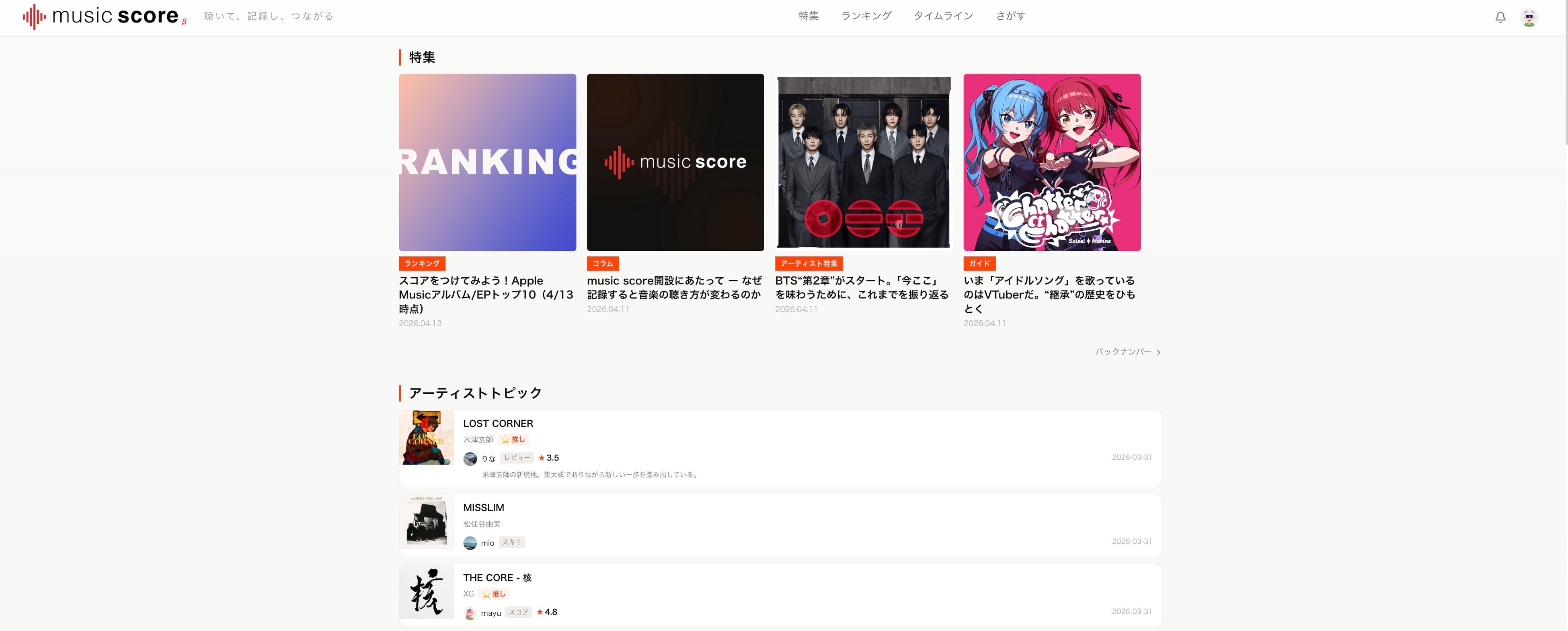●music score:「聴いて、記録して、つながる。音楽がもっと好きになる場所。」をテーマとする音楽レビュープラットフォーム