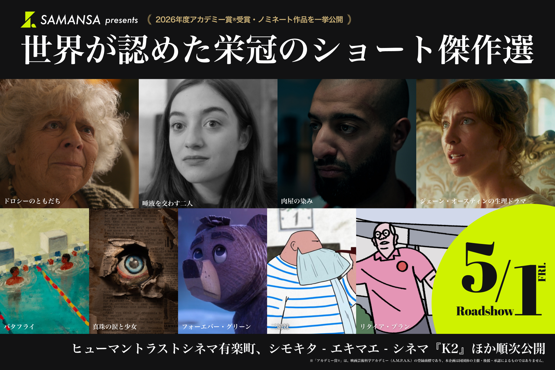 ショート映画配信サービス「SAMANSA」を展開する株式会社SAMANSA(本社:東京都、代表取締役:岩永祐一)は、アカデミー賞®受賞・ノミネート作を含む傑作9編の劇場上映プロジェクト『SAMANSA presents 世界が認めた栄冠のショート傑作選~2026年度アカデミー賞®受賞・ノミネート作品を一挙公開~』において、新たに「シモキタ – エキマエ – シネマ『K2』」(下北沢)での上映が決定したことをお知らせいたします。