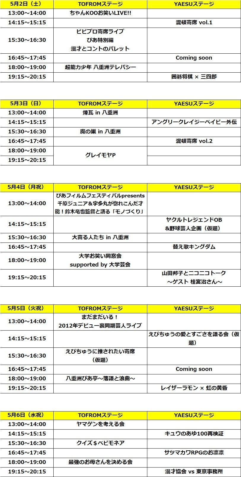 メイン会場は「TOFROM STAGE」「YAESU STAGE」2つのステージ。約200席の会場で、1日5~6ステージの公演を開催いたします。