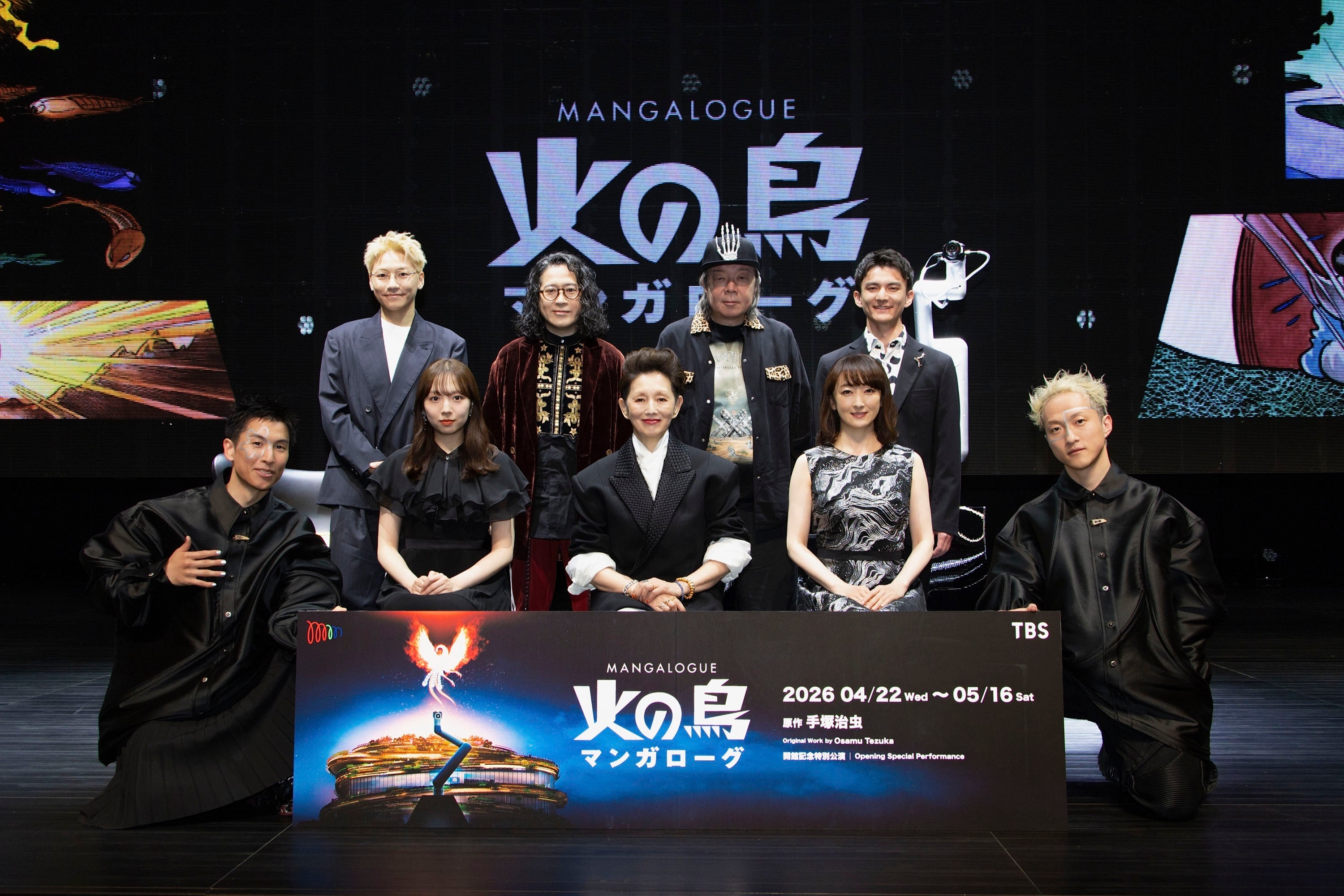 昨日行われた公開ゲネプロに、声優およびナビゲートを務めるマンガローガーと呼ばれる豪華キャスト陣が顔を揃えた。「マンガローグ:火の鳥」は、手塚治虫原作「火の鳥」のマンガに描かれた絵や言葉を起点に、観客全体で読み進めながらその世界に没入していくという新感覚の劇場型のマンガライブイマーシブステージ。