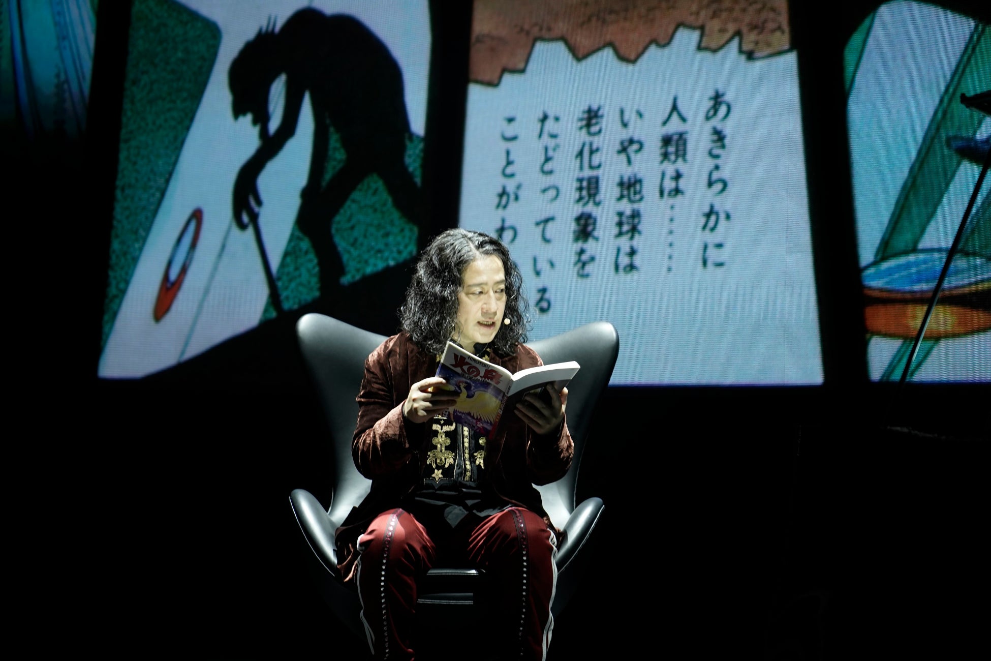 まずは先端にカメラを備えたロボットアーム「鉄腕アーム」が自己紹介。そして「マンガローガー」として又吉直樹が登壇した。真正面と両サイドにある巨大LED画面にマンガのコマが投影され、声優たちのセリフとBGMが流れる。「鉄腕アーム」(声:山寺宏一)の軽妙なおしゃべりとページをめくる役の「高橋さん」のパフォーマンス、そして、「マンガローガー」又吉直樹がト書きを読んだり、突っ込みを入れたり、感想を述べたりしながら、ライブ感覚でそこにいる観客はいつの間にか物語に没頭していく。